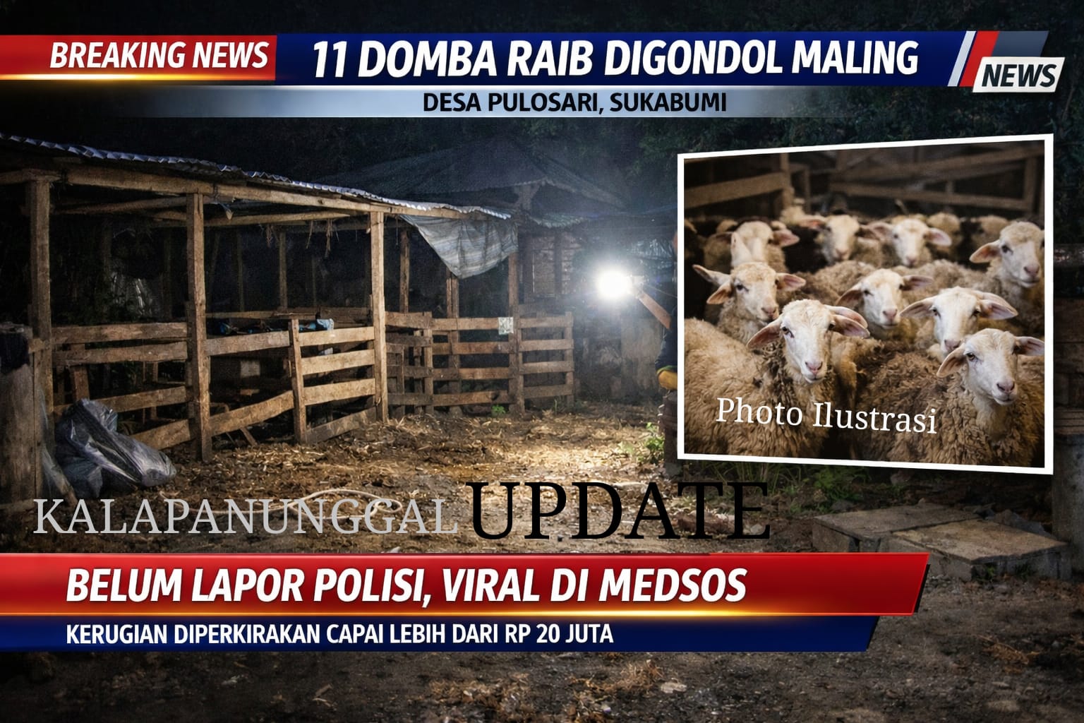KALAPANUNGGALUPDATE.COM | CIGOONG DESA PULOSARI KALAPANUNGGAL. – ( 13/2/2026 ). Aksi pencurian ternak kembali meresahkan warga Desa Pulosari. Sebanyak 11 ekor domba dilaporkan hilang pada Kamis malam (12/2/2026) di dua kampung berbeda, yakni Kampung Raksamala dan Kampung Cigoong II. Informasi kejadian ini pertama kali beredar melalui status WhatsApp dan media sosial warga, dan hingga kini para pemilik disebut belum melaporkan secara resmi ke pihak kepolisian.