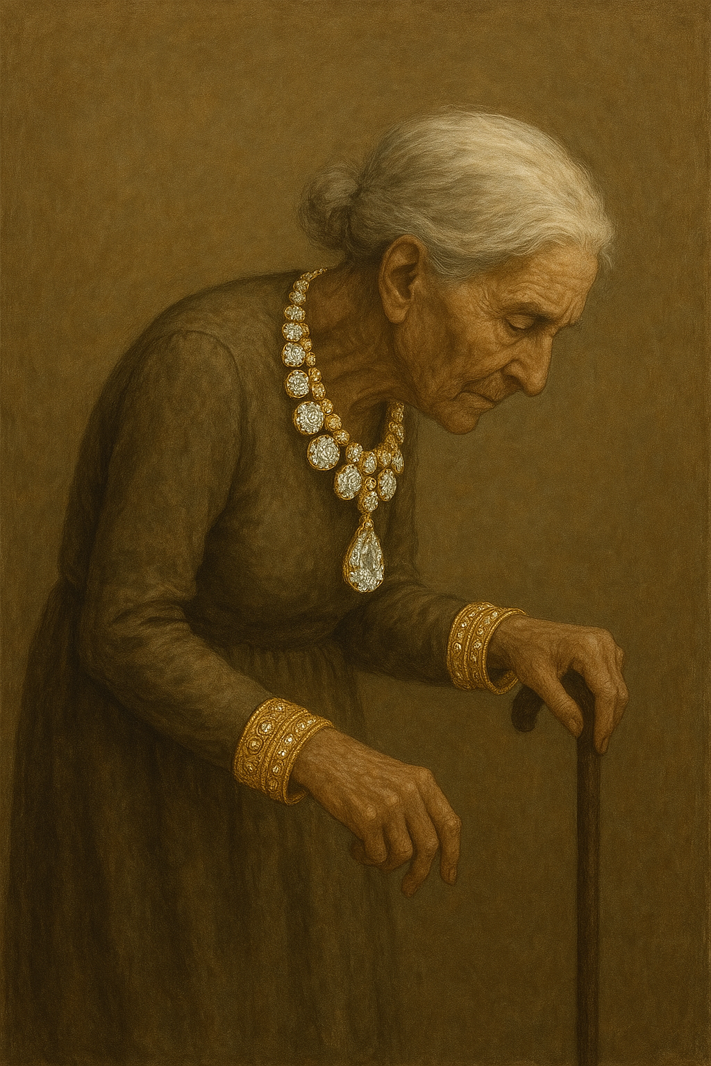 Seolah-olah di hadapan mereka tergambar sosok seorang wanita renta. Tubuhnya bungkuk, kulitnya keriput, namun lehernya penuh kalung berlian, tangannya dipenuhi gelang emas yang berkilau. Semua perhiasan itu tak mampu menutupi kenyataan: ia rapuh, lemah, dan hampir roboh.
