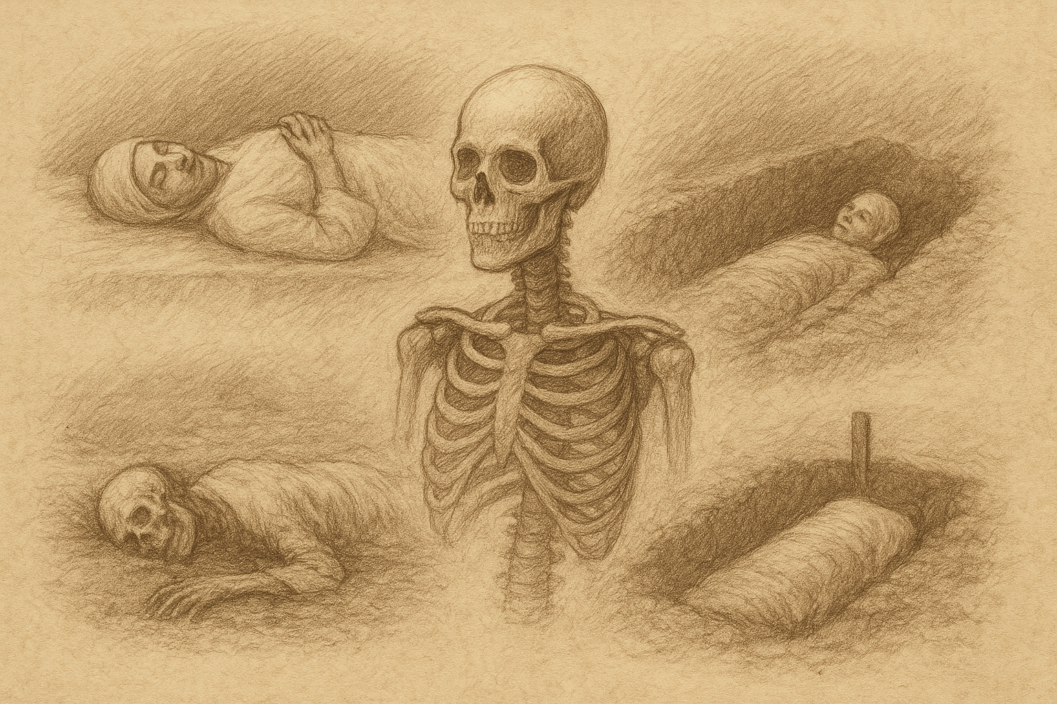 Ilustrasi perjalanan jasad manusia menggambarkan perubahan tubuh dari hari pertama hingga satu tahun setelah meninggal dunia.
