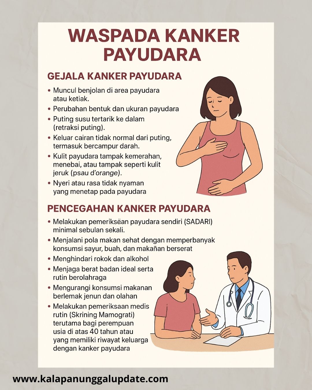 Kalapanunggalupdate.com – Kanker payudara masih menjadi salah satu penyakit dengan angka kasus tertinggi pada perempuan di Indonesia. Berdasarkan data Global Cancer Observatory (GLOBOCAN) 2022, tercatat lebih dari 70 ribu kasus baru kanker payudara di Indonesia, dengan angka kematian yang cukup tinggi akibat keterlambatan deteksi. ( 2 Agustus 2025 ).