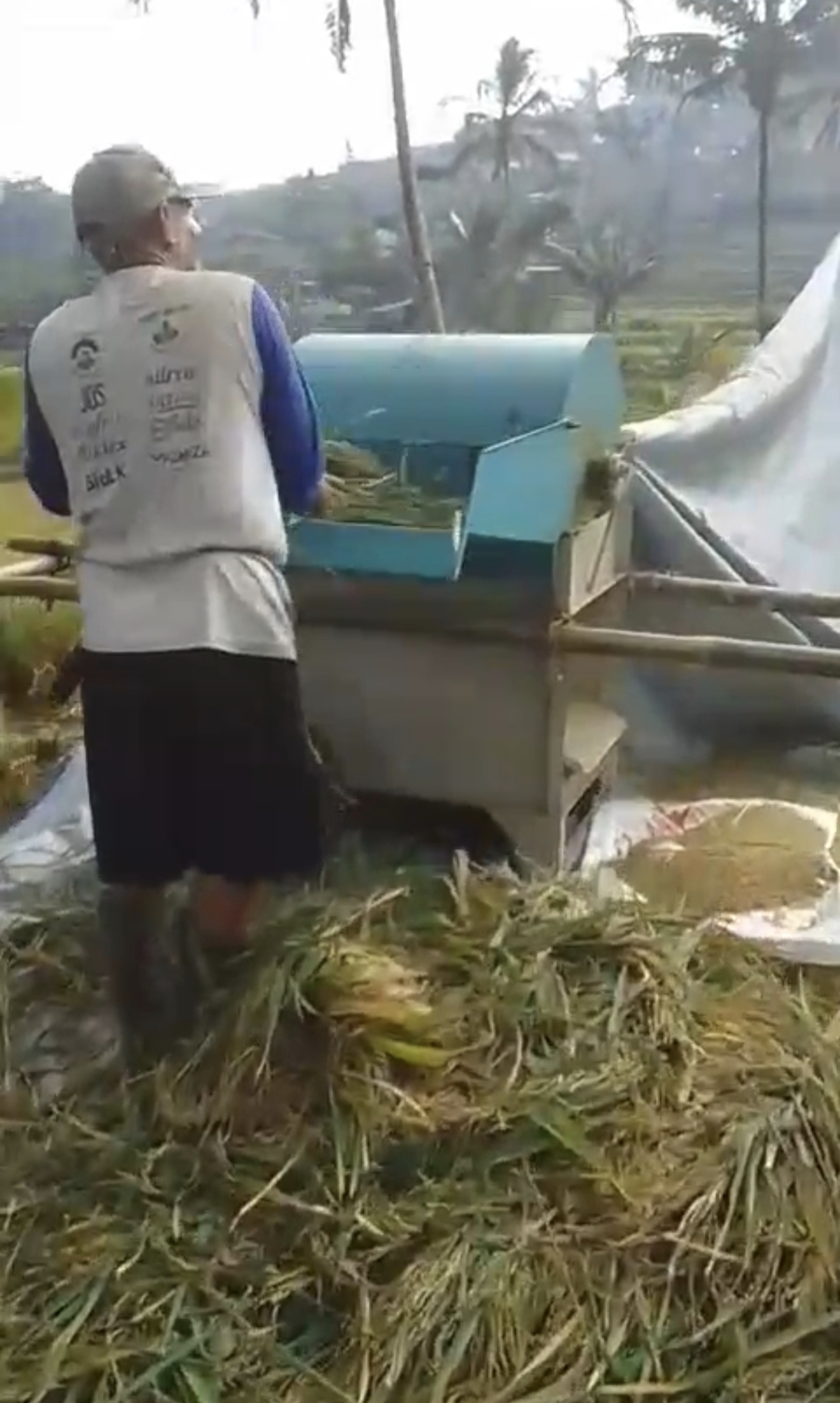 Para petani terlihat menggunakan mesin perontok padi untuk memisahkan bulir padi dari tangkainya. Dengan cara ini, hasil panen dapat lebih cepat dan efisien, sehingga mendukung peningkatan produktivitas kelompok tani.