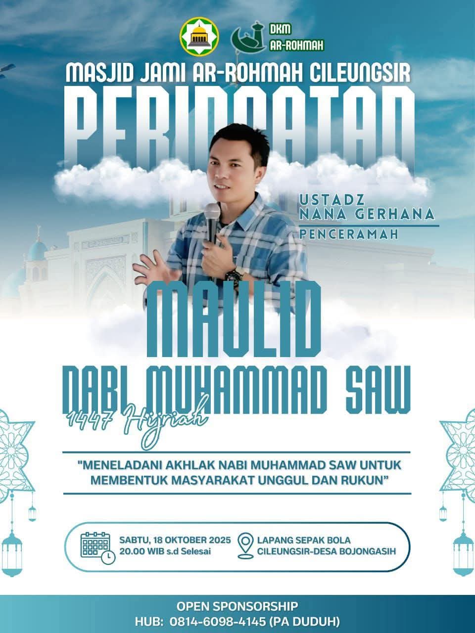 Kalapanunggalupdate.com– Dalam rangka memperingati Maulid Nabi Muhammad SAW 1447 Hijriah, Masjid Jami Ar-Rohmah Cileungsir akan menggelar acara keagamaan yang dipusatkan di Lapang Sepak Bola Cileungsir, Desa Bojongasih, pada Sabtu (18/10/2025) mulai pukul 20.00 WIB hingga selesai. ( 11/9/2025 ).