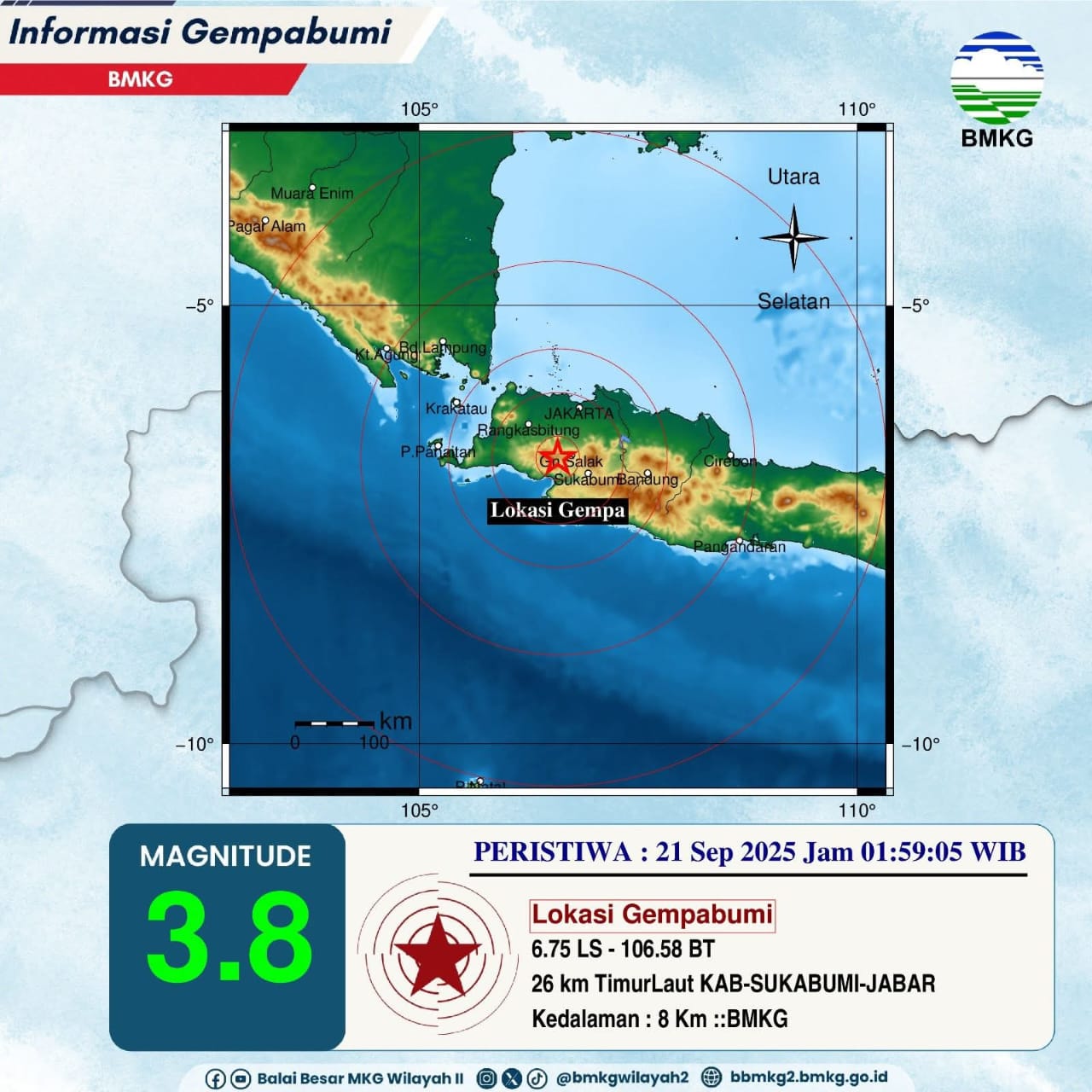 Kalapanunggalupdate.com,– ( 21/9/2025 ). Badan Meteorologi, Klimatologi, dan Geofisika (BMKG) melaporkan telah terjadi gempa bumi di wilayah Kabupaten Sukabumi, Jawa Barat, pada Minggu (21/9/2025) pukul 01:59:05 WIB.