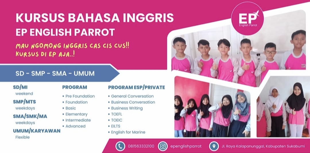 Kalapanunggalupdate.com, – Kabar gembira bagi para orang tua dan anak-anak sekolah dasar! Kini telah hadir EP English Parrot, lembaga kursus Bahasa Inggris yang menawarkan metode belajar mudah, interaktif, dan menyenangkan khusus bagi siswa sekolah dasar. (25/9/2025 ).