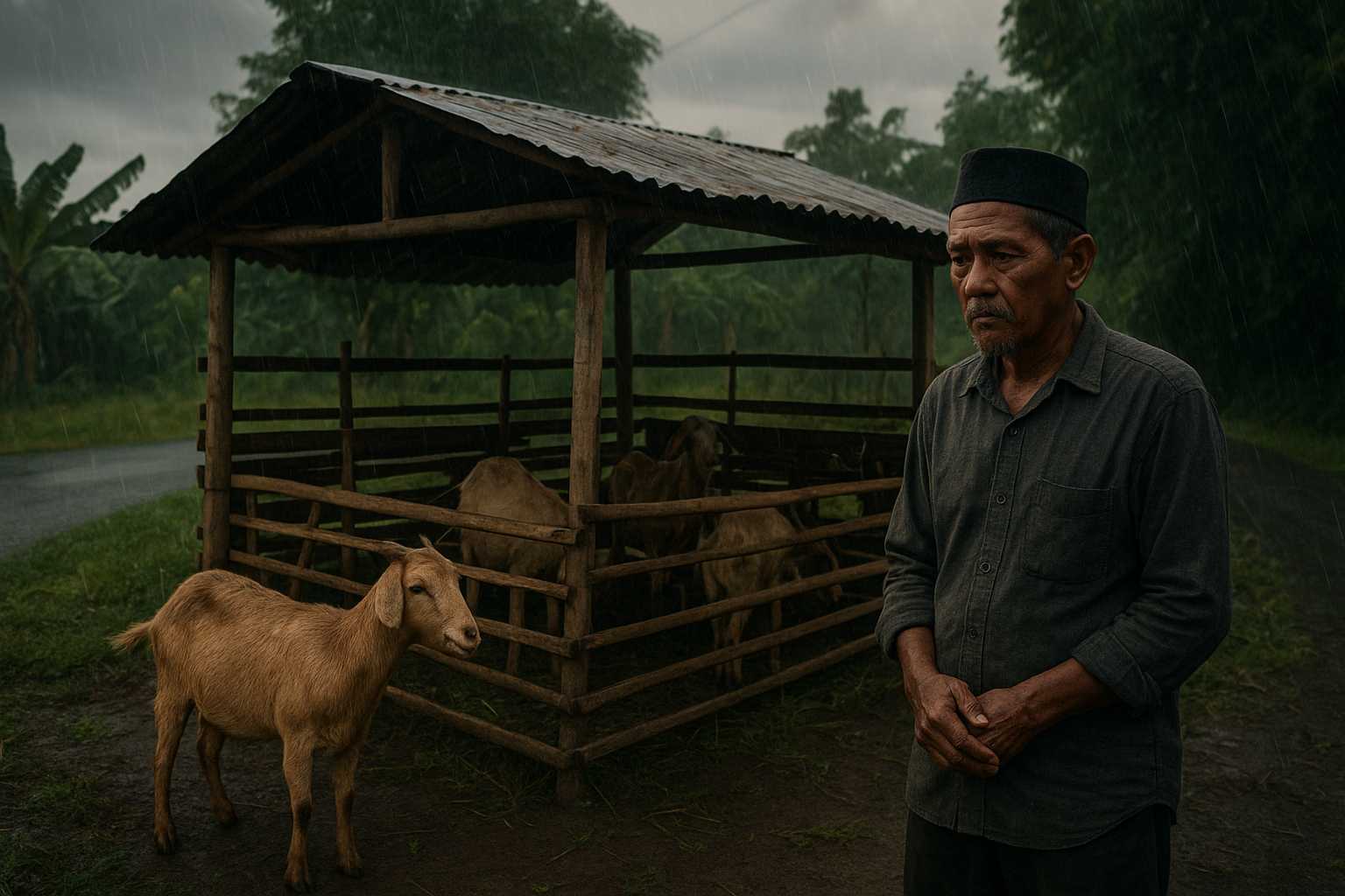 “Pagi masih ada, saya kasih makan. Tapi pas sore sekitar jam setengah lima kambing tinggal dua, satu hilang,” ungkap Abah Kanta dengan nada kecewa.