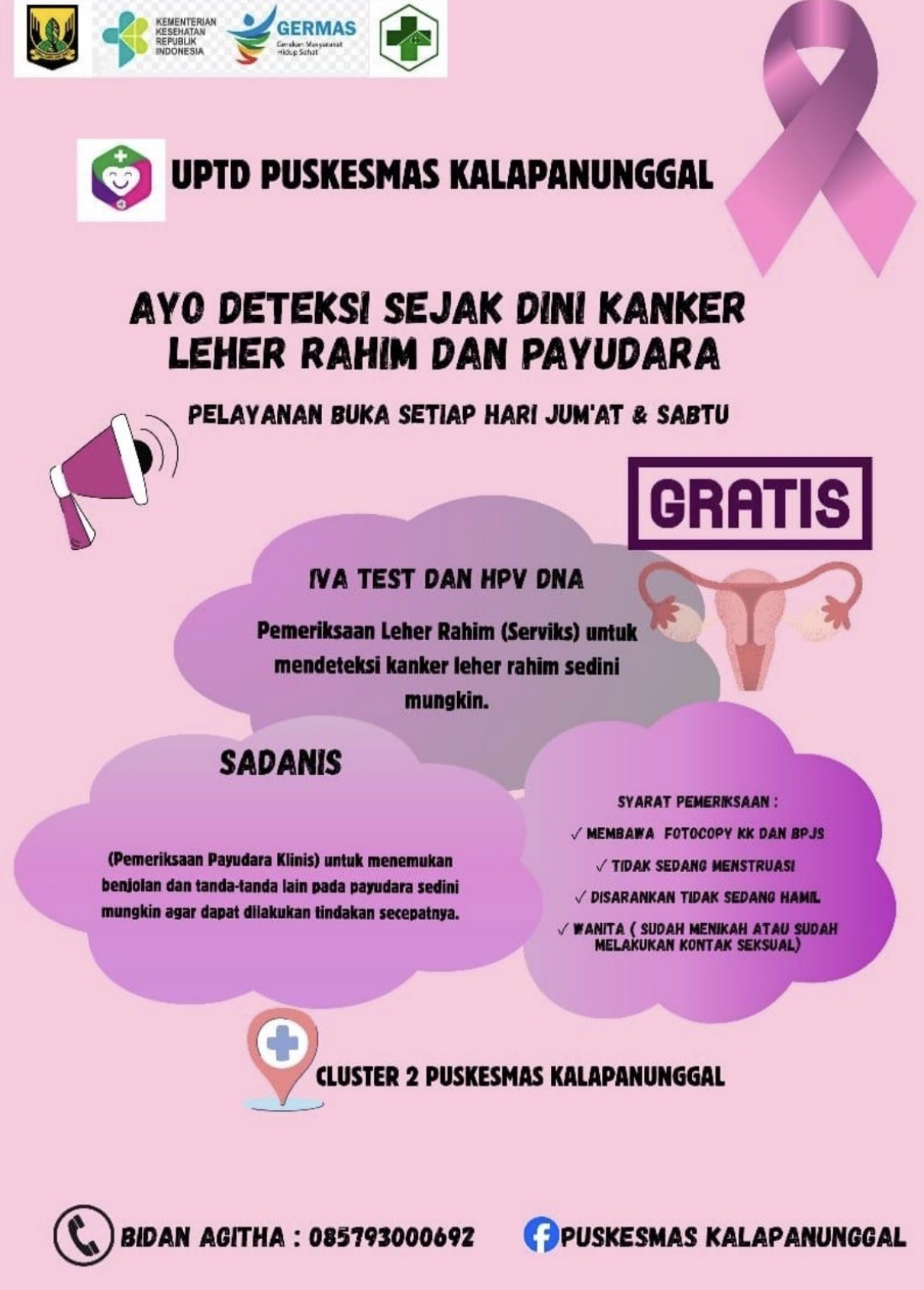 Kalapanunggalupdate.com, – ( 2/10/2025 ). UPTD Puskesmas Kalapanunggal terus berupaya meningkatkan derajat kesehatan masyarakat, khususnya dalam pencegahan kanker pada kaum perempuan. Melalui program pemeriksaan deteksi dini kanker leher rahim (serviks) dan payudara, pelayanan ini dibuka secara gratis setiap hari Jumat dan Sabtu di Puskesmas Kalapanunggal Cluster 2.