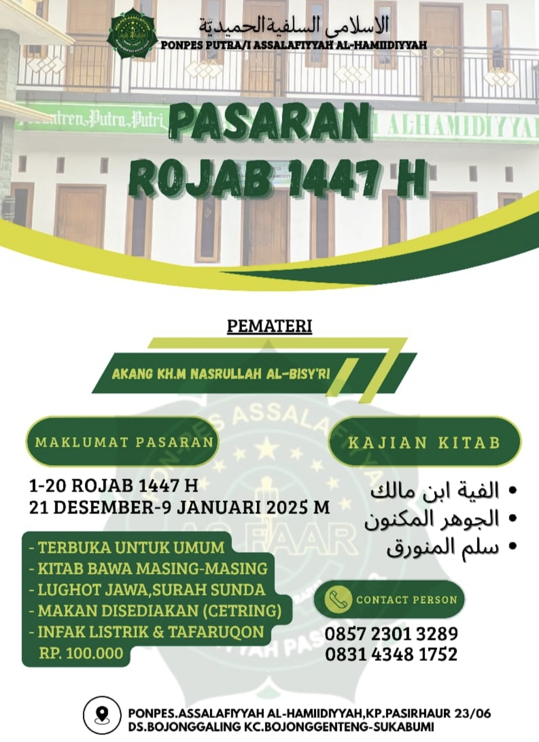 Kalapanunggalupdate.com, – ( 3/10/2025 ). Pondok Pesantren Putra/Putri Assalafiyyah Al-Hamidiyyah kembali menggelar kegiatan Pasaran Rojab 1447 H yang akan berlangsung mulai 1–20 Rojab 1447 H atau bertepatan dengan 21 Desember 2024 – 9 Januari 2025 M.