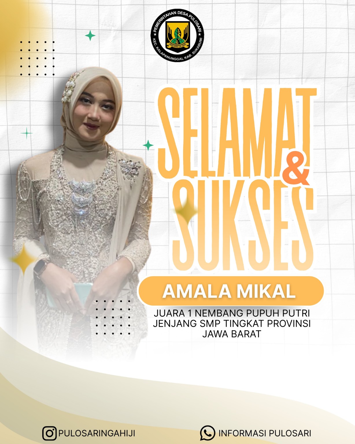 Kalapanunggalupdate.com, — ( 8/10/2025 ). Pemerintah Desa Pulosari dengan penuh rasa bangga mengucapkan selamat dan sukses kepada Amala Mikal Asonah, siswi berprestasi dari SMP PGRI 1 Kalapanunggal, yang berhasil meraih Juara 1 Nembang Pupuh Putri Jenjang SMP Tingkat Provinsi Jawa Barat.