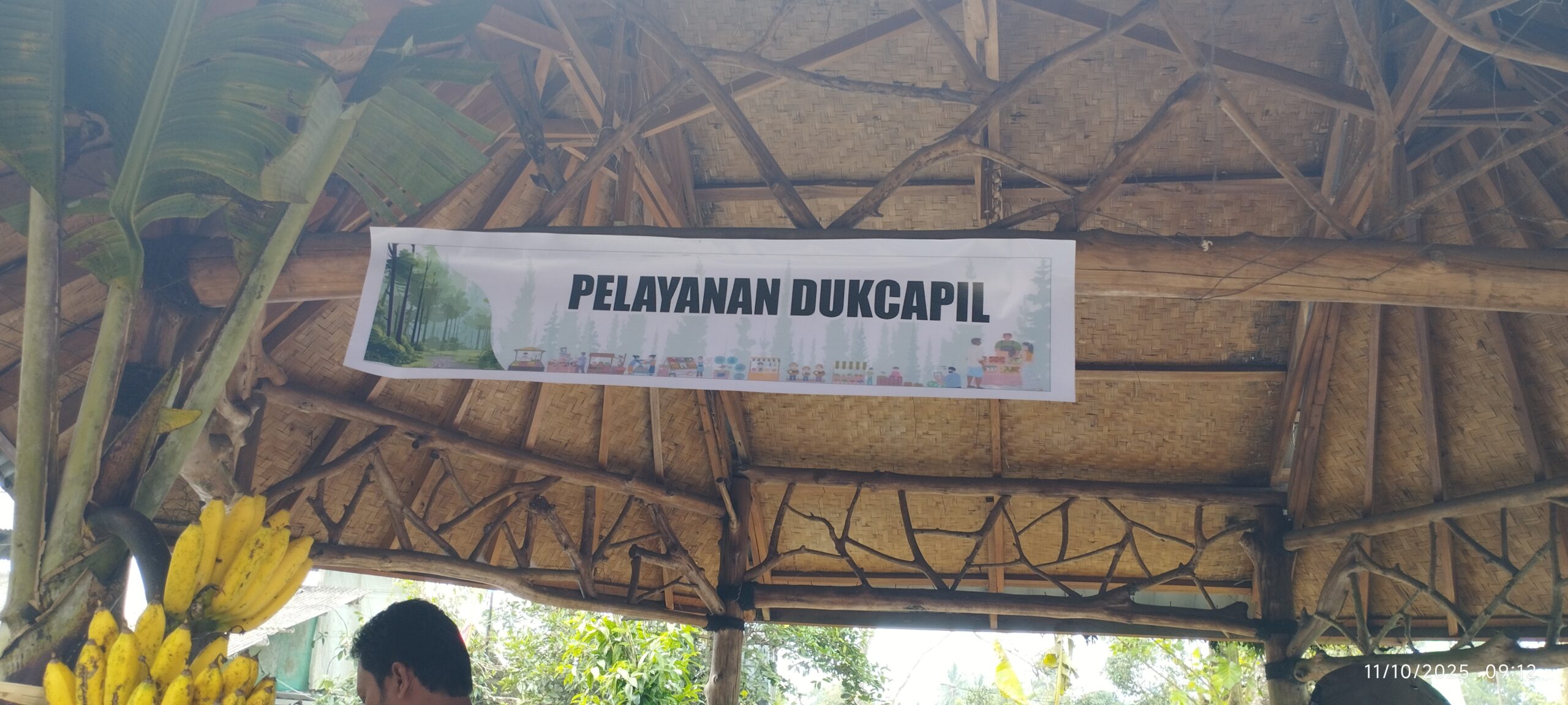 Di bawah saung bambu bertuliskan “Pelayanan Dukcapil”, petugas tampak sibuk melayani warga yang datang untuk mencetak Kartu Keluarga, Akta Kelahiran, hingga melakukan konsolidasi data bagi warga yang e-KTP-nya tidak aktif atau bermasalah.