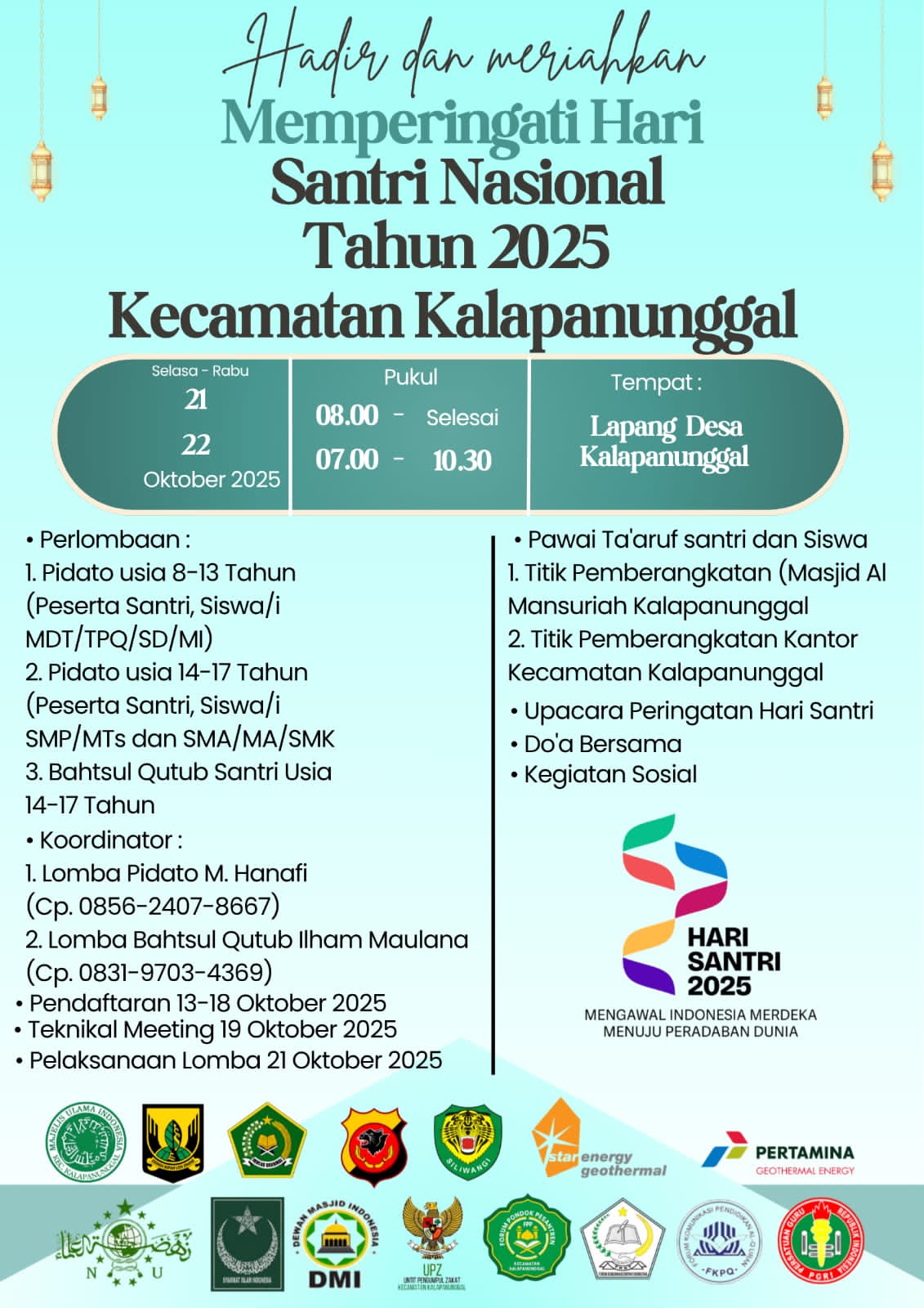 Kalapanunggalupdate.com, – ( 11/10/2025 ). Menyambut datangnya Hari Santri Nasional Tahun 2025, Kecamatan Kalapanunggal tengah bersiap menggelar rangkaian kegiatan meriah yang akan melibatkan ribuan santri, siswa, dan masyarakat. Kegiatan tersebut akan berlangsung di Lapang Desa Kalapanunggal pada 21–22 Oktober 2025, dengan beragam agenda yang sarat nilai keislaman dan kebangsaan.