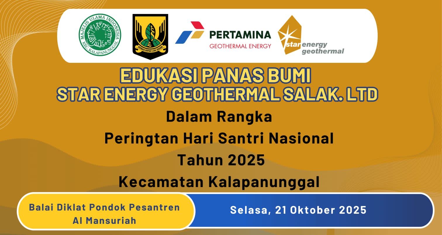 Kalapanunggalupdate.com, – (18/10/2025 ). Dalam rangka memperingati Hari Santri Nasional Tahun 2025, Star Energy Geothermal Salak Ltd. kembali menunjukkan komitmennya untuk terus berkontribusi pada kegiatan sosial, pendidikan, dan keagamaan di wilayah operasionalnya. Tahun ini, perusahaan energi panas bumi terkemuka tersebut turut ambil bagian dalam kegiatan “Edukasi Panas Bumi” yang digelar di Kecamatan Kalapanunggal, Kabupaten Sukabumi.