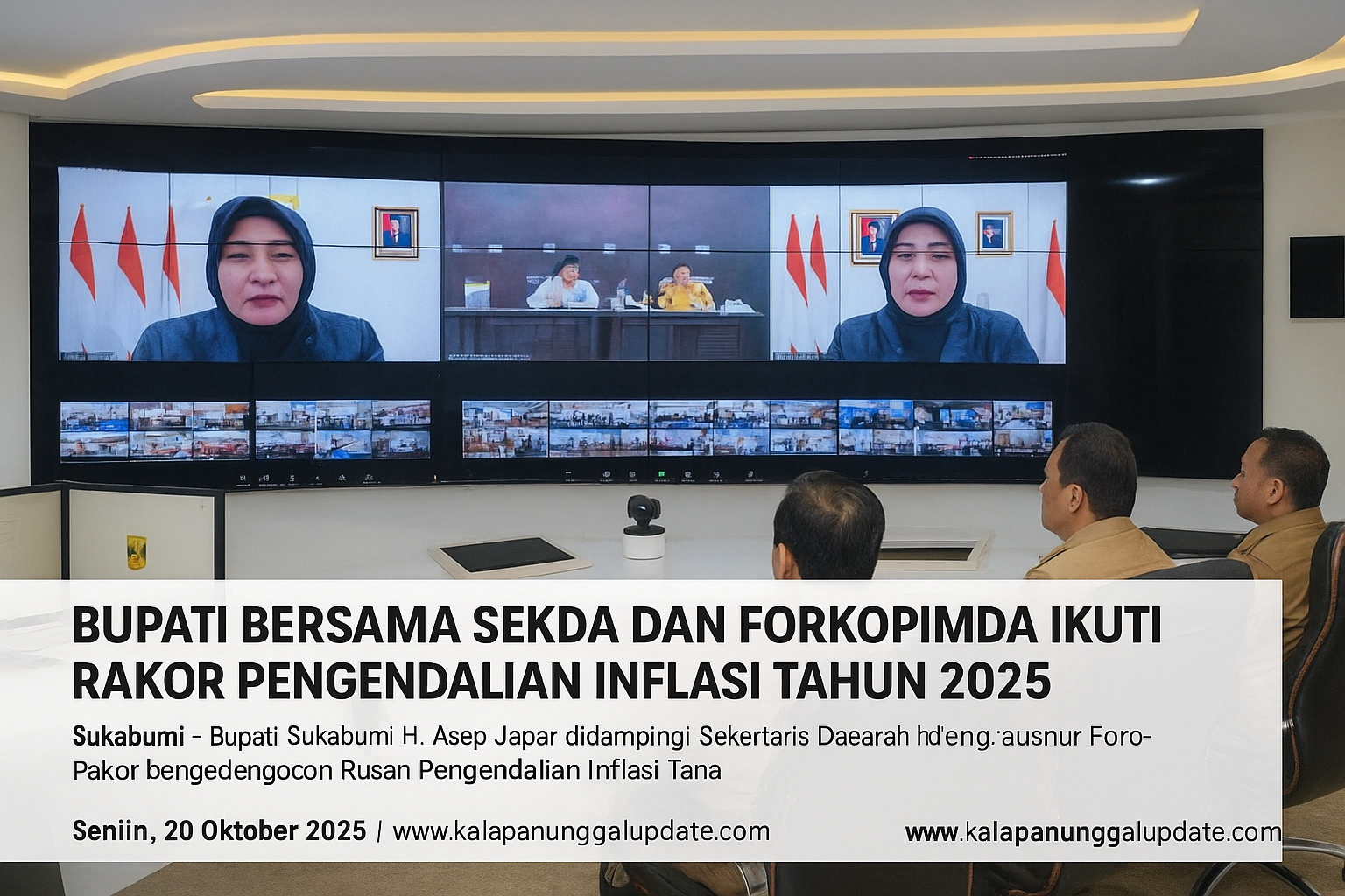 Kalapanunggalupdate.com, Sukabumi – Bupati Sukabumi H. Asep Japar bersama Sekretaris Daerah H. Ade Suryaman serta unsur Forkopimda mengikuti Rapat Koordinasi (Rakor) Pengendalian Inflasi Tahun 2025 secara virtual dari Command Center Setda Palabuhanratu, Senin (20/10/2025).
