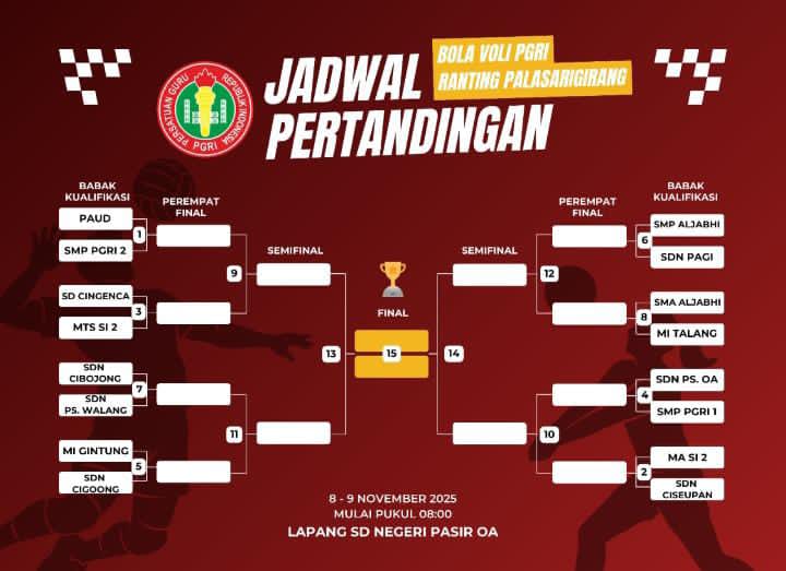 Kalapanunggalupdate.com, ( 26/10/2025 ). – Dalam rangka memperingati Hari Guru Nasional sekaligus mempererat silaturahmi antar lembaga pendidikan, PGRI Ranting Palasari Girang menggelar Turnamen Bola Voli PGRI Tahun 2025 yang berlangsung pada 8–9 November 2025 di Lapang SD Negeri Pasir OA.