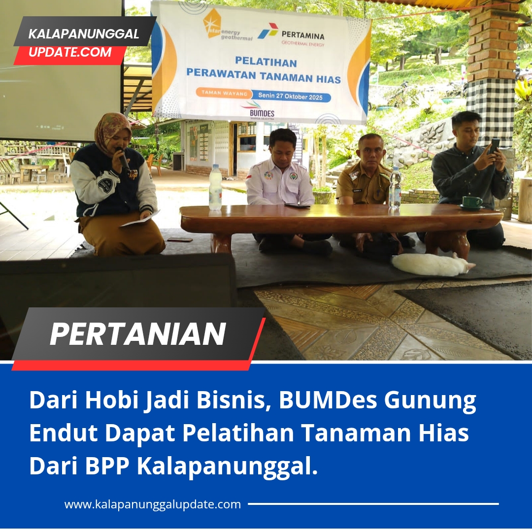 Kalapanunggalupdate.com, — ( 27/10/2025 ). Suasana sejuk dan asri di Taman Wayang menjadi saksi antusiasme para peserta dalam kegiatan Pelatihan Perawatan Tanaman Hias yang digelar pada Senin (27/10/2025). Kegiatan ini merupakan hasil kolaborasi antara Pertamina Geothermal Energy, BPP Kecamatan Kalapanunggal, serta BUMDes Gunung Endut dalam rangka meningkatkan keterampilan dan kreativitas masyarakat desa.