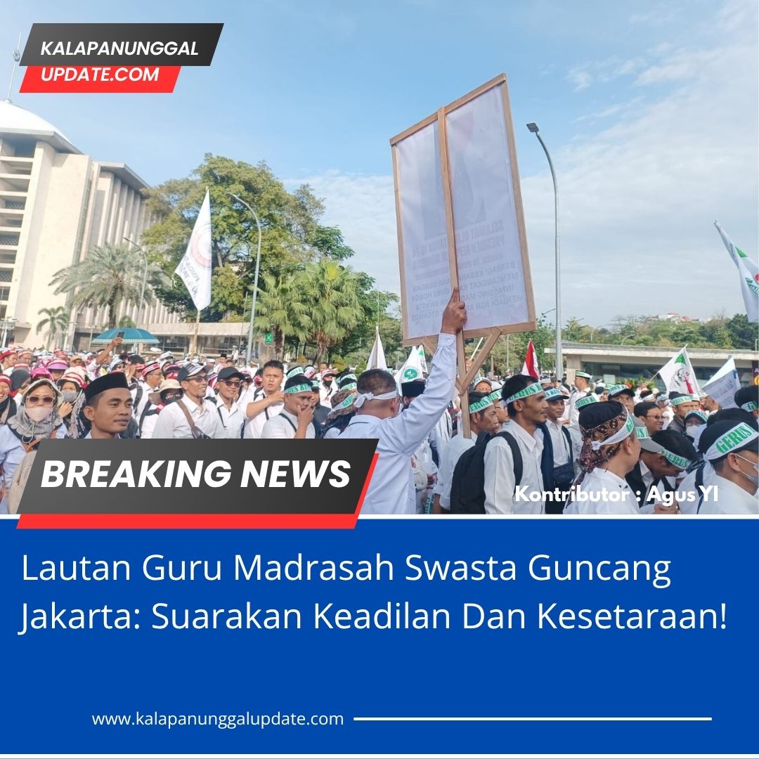 Kalapanunggalupdate.com, Jakarta, – Ribuan guru madrasah swasta dari berbagai daerah di Indonesia tumpah ruah memenuhi kawasan Patung Kuda, Jakarta Pusat, Kamis (30/10/2025). Dalam aksi damai bertajuk “Guru Bersatu, Suarakan Keadilan”, para pendidik ini menyuarakan aspirasi untuk memperoleh keadilan dan kesetaraan dalam kebijakan pendidikan nasional.