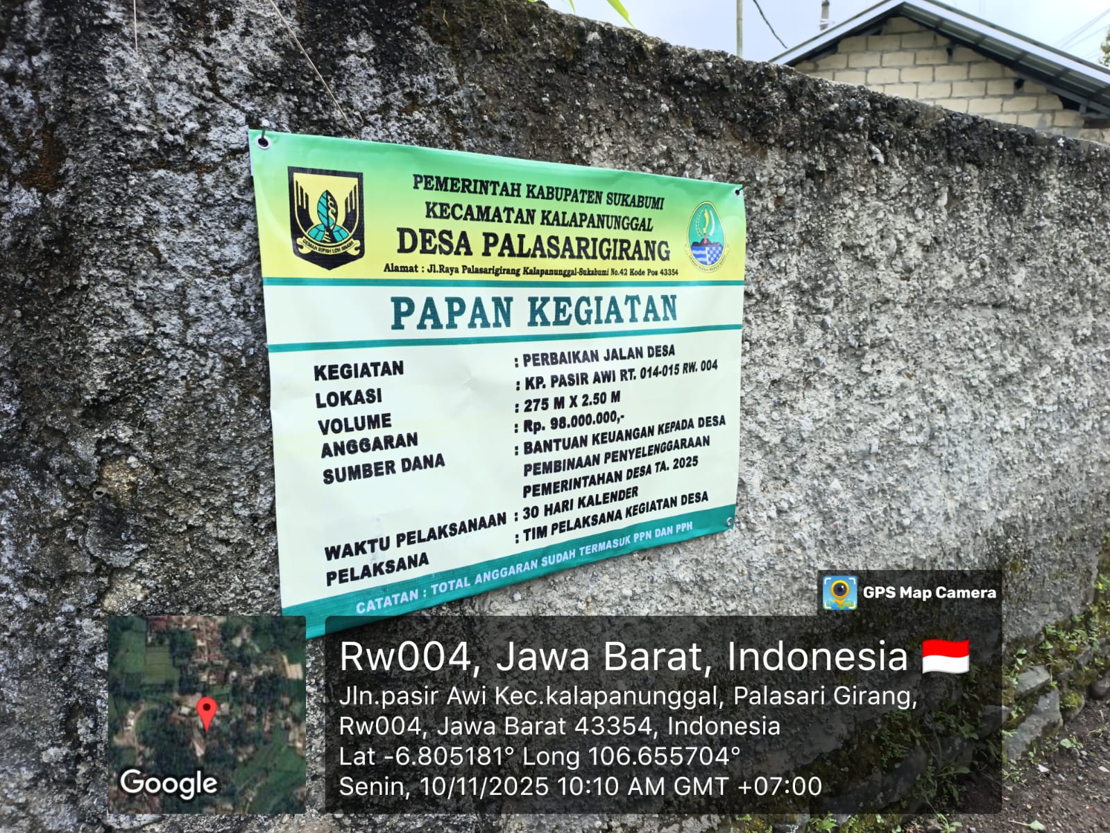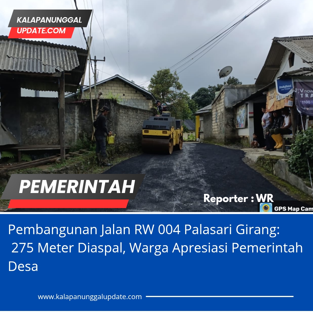 Kalapanunggalupdate.com. Desa Palasari Girang, Jawa Barat – Infrastruktur jalan lingkungan di RW 004, Desa Palasari Girang, Kecamatan Kalapanunggal, Kabupaten Sukabumi kini mengalami peningkatan signifikan. Pengaspalan jalan sepanjang 275 meter dengan lebar 2,5 meter resmi dilaksanakan pada Senin (10/11/2025) sekitar pukul 09.58 WIB.