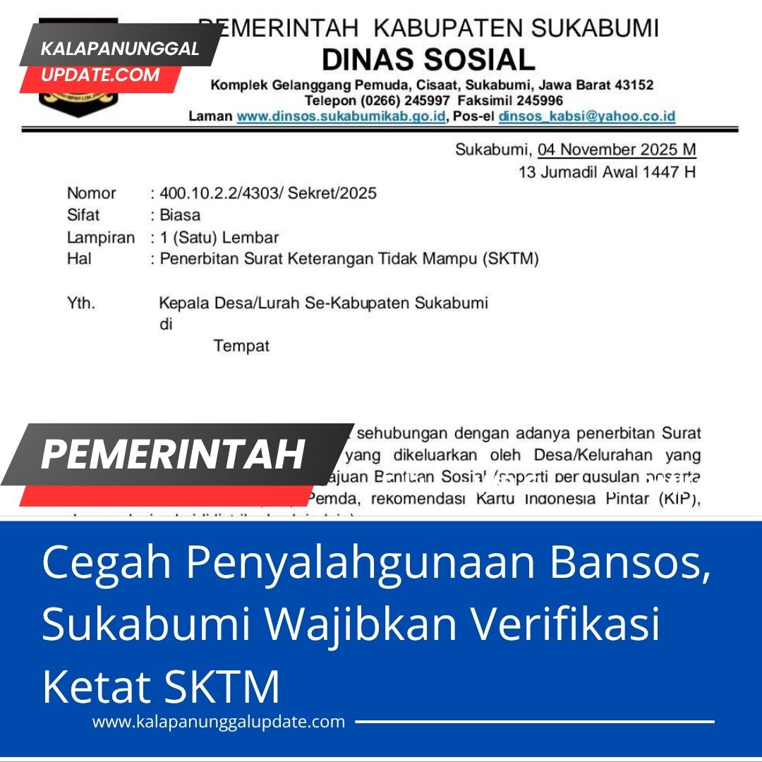 Kalapanunggalupdate.com, Pemkab Sukabumi, ( 12/11/2025 ). 2025 – Pemerintah Kabupaten Sukabumi melalui Dinas Sosial resmi mengeluarkan Surat Edaran mengenai pengetatan penerbitan Surat Keterangan Tidak Mampu (SKTM) bagi masyarakat. Kebijakan ini ditujukan kepada seluruh Kepala Desa dan Lurah se-Kabupaten Sukabumi untuk memastikan pemberian SKTM tepat sasaran dan benar-benar diberikan kepada warga yang masuk kategori miskin sesuai standar nasional.