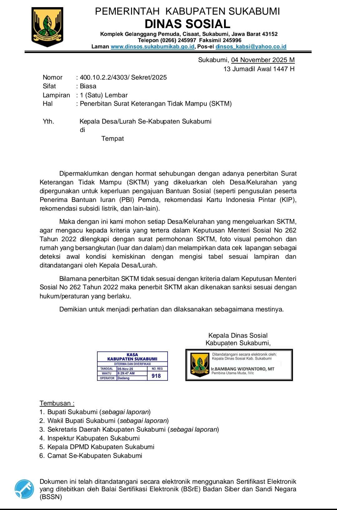 Surat edaran tersebut juga ditembuskan kepada Bupati Sukabumi, Wakil Bupati, Sekretaris Daerah, Inspektur Kabupaten, Kepala DPMD, serta seluruh Camat sebagai bentuk pengawasan dan komitmen bersama memastikan ketepatan data penerima bantuan.