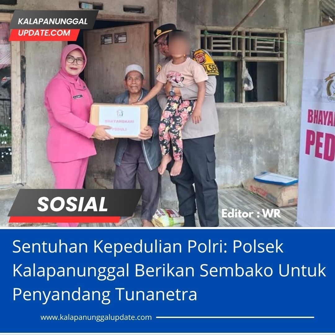Kalapanunggalupdate.com, Kalapanunggal, ( 14/11/2025 ). Polsek Kalapanunggal kembali menunjukkan komitmennya dalam menjaga kedekatan dengan masyarakat melalui kegiatan sosial yang penuh kepedulian. Pada Jumat (14/11/2025), Kapolsek Kalapanunggal AKP M. Damar Gunawan, S.Pd, bersama Ketua Bhayangkari Ranting Kalapanunggal Ny. Lia Damar Gunawan, serta anggota Polsek Kalapanunggal, melaksanakan giat bakti sosial dengan memberikan tali asih berupa paket sembako dan santunan kepada warga penyandang tunanetra di wilayah hukum Polsek Kalapanunggal.