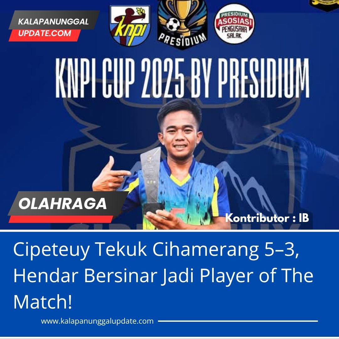 Salah satu pemain yang tampil luar biasa dalam pertandingan ini adalah Hendar, pemain andalan Cipeteuy FC. Berkat kontribusi besarnya, ia dinobatkan sebagai Player of The Match untuk putaran keenam KNPI Cup 2025. Tak hanya itu, Hendar juga kini mencatatkan dirinya sebagai top skor sementara, melewati posisi yang sebelumnya ditempati oleh pemain lain, yakni Riki.