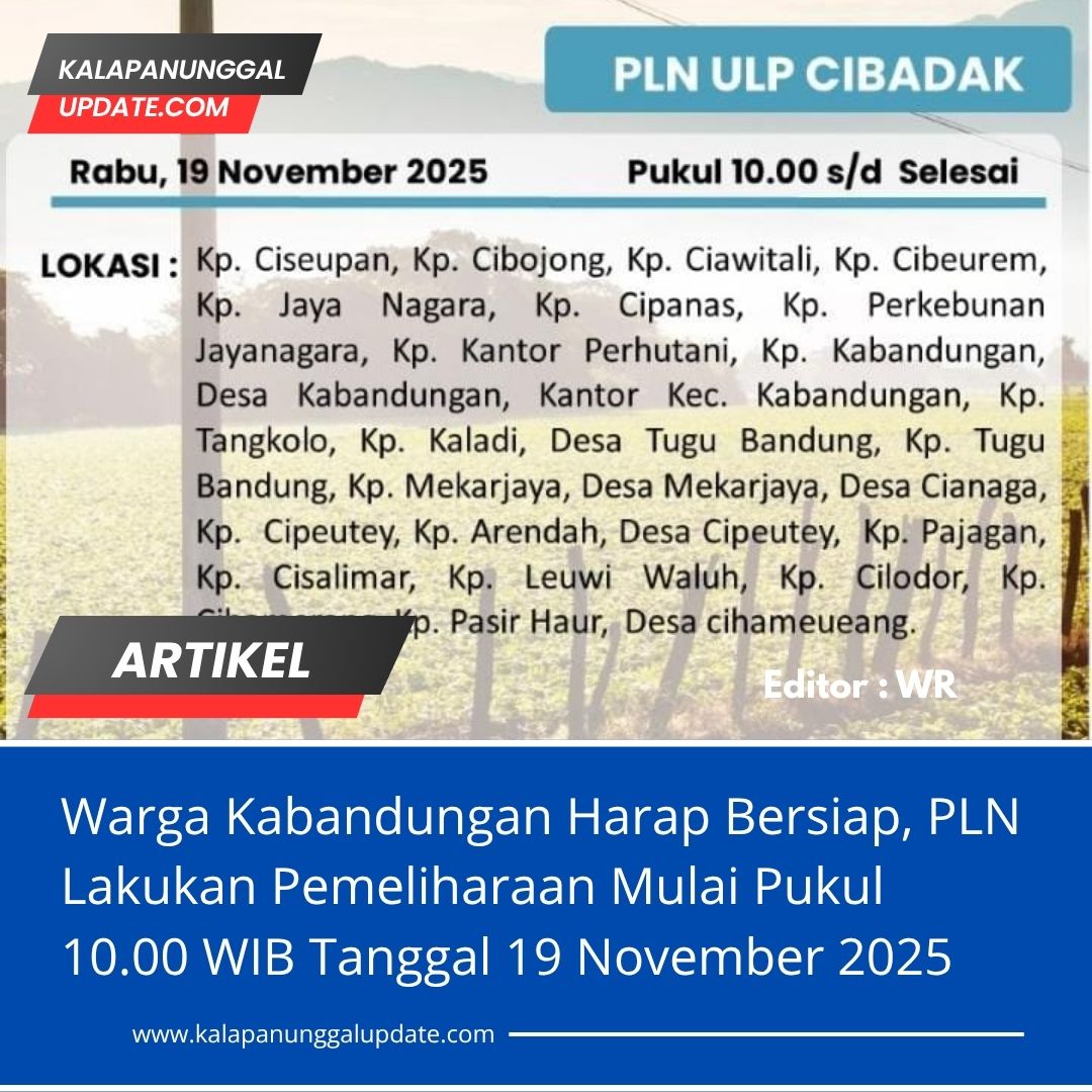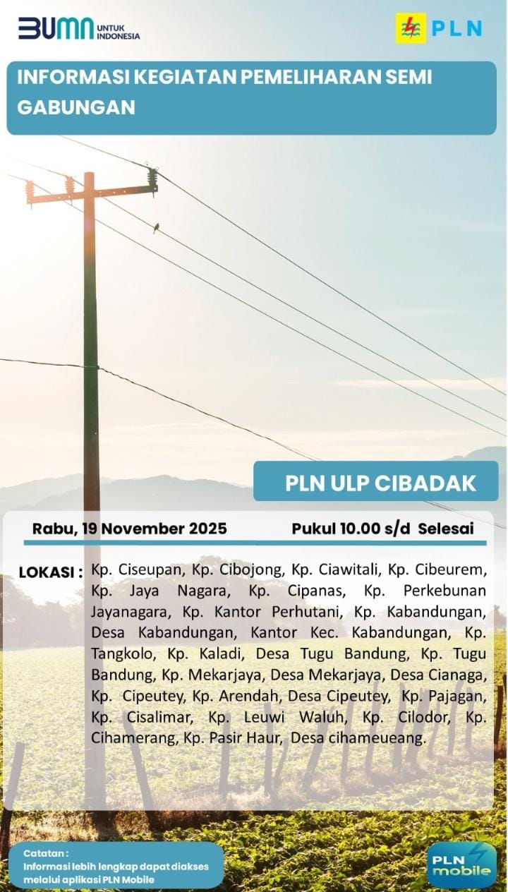 Kalapanunggalupdate.com, Kecamatan Kabandungan, – ( 17/11/2025 ). PLN ULP Cibadak mengeluarkan pemberitahuan resmi terkait kegiatan pemeliharaan semi gabungan yang akan dilaksanakan pada Rabu, 19 November 2025, mulai pukul 10.00 WIB hingga selesai. Kegiatan ini merupakan langkah rutin PLN dalam menjaga keandalan pasokan listrik serta memastikan jaringan tetap aman dan optimal.