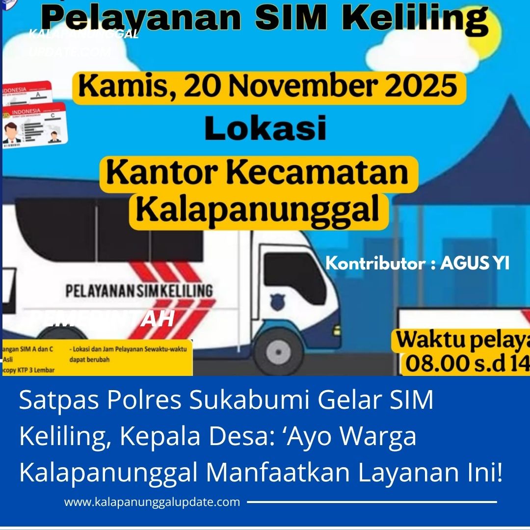 Kalapanunggalupdate.com, Desa Kalapanunggal, – ( 19/11/2025 ). Satpas Polres Sukabumi kembali menghadirkan layanan publik yang memudahkan masyarakat dalam pengurusan administrasi berkendara melalui program Pelayanan SIM Keliling. Kegiatan ini dilaksanakan pada Kamis, 20 November 2025, bertempat di halaman Kantor Kecamatan Kalapanunggal.