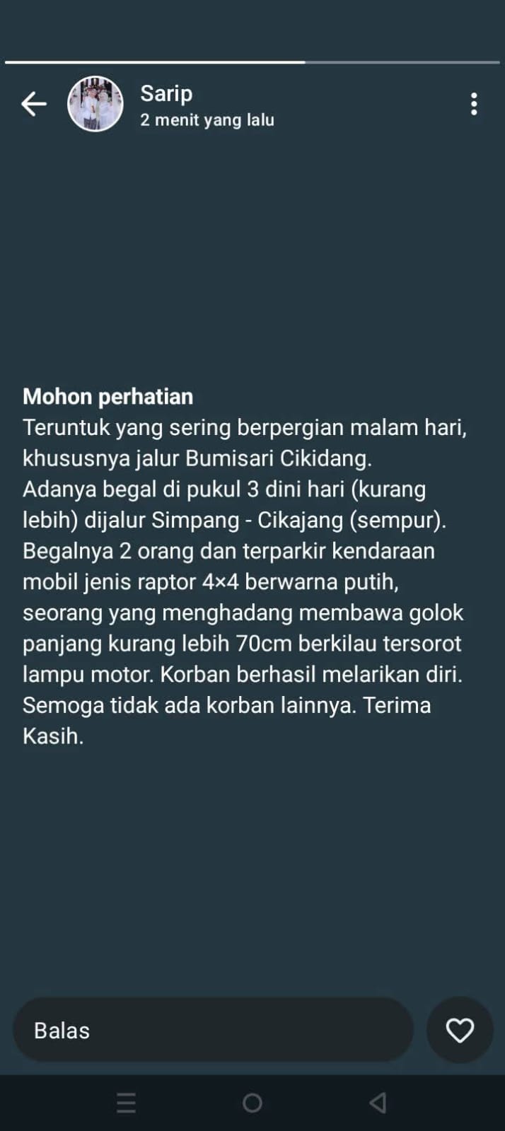 Beruntung, korban berhasil mengendalikan situasi dan melarikan diri sebelum terjadi tindakan kekerasan lebih lanjut. Hingga kini belum ada laporan korban lain, namun warga dihimbau tetap waspada ketika melintasi jalur tersebut, terutama pada jam-jam rawan.