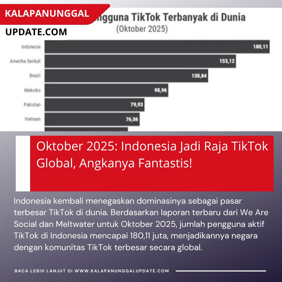 Kalapanunggalupdate.com, – ( 25/11/2025 ). Indonesia kembali menegaskan dominasinya sebagai pasar terbesar TikTok di dunia. Berdasarkan laporan terbaru dari We Are Social dan Meltwater untuk Oktober 2025, jumlah pengguna aktif TikTok di Indonesia mencapai 180,11 juta, menjadikannya negara dengan komunitas TikTok terbesar secara global.
