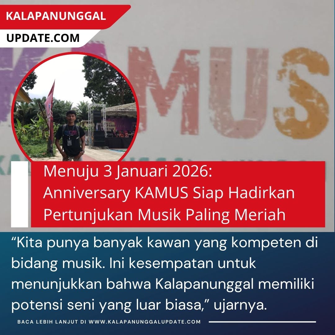 Kalapanunggalupdate.com, Kecamatan Kalapanunggal, – ( 26/11/2025 ). Perayaan Anniversary KAMUS (Kalapanunggal Musician) 2026 semakin dekat. Dengan mengusung tema besar “Unity From Diversity”, acara akbar yang akan digelar pada 3 Januari 2026 ini diproyeksikan menjadi panggung spektakuler bagi musisi-musisi berbakat di Kecamatan Kalapanunggal. Dari panggung rakyat hingga area persiapan teknis, seluruh panitia terus bergerak memastikan perhelatan ini berlangsung meriah, aman, dan penuh kesan.