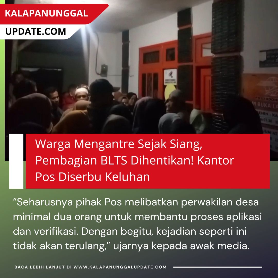 Kalapanunggalupdate.com, Kecamatan Kalapanunggal, – ( 27/11/2025 ). Pembagian BLTS di putuskan di tunda hingga esok oleh pihak pos,warga Pulosari penerima mampaat kecewa hampir tidak kondusip,karena mengantri dari jam satu siang hingga kini,akhir nya di lakukan kordinasi oleh sbagian pihak ketua RT.dibuka kembali sampai jam 8 malam untuk kedusunan ciseupan saja meski sebagian penerima sudah pada pulang dusun yang lain besok di lanjut kan.