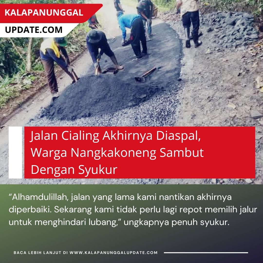 Kalapanunggalupdate.com, Kecamatan Cikidang, – ( 29/11/2025 ). Harapan panjang masyarakat akhirnya terwujud. Jalan wilayah Cialing, Desa Nangkakoneng, Kecamatan Cikidang, kini resmi diperbaiki melalui program aspirasi masyarakat yang disampaikan kepada anggota Dewan Hera Iskandar dari Fraksi Gerindra, Komisi III, Dapil III. Proyek pengaspalan ini menjadi angin segar bagi warga yang selama ini menghadapi kondisi jalan rusak dan penuh lubang. Jum’at ( 28/11/2025 )