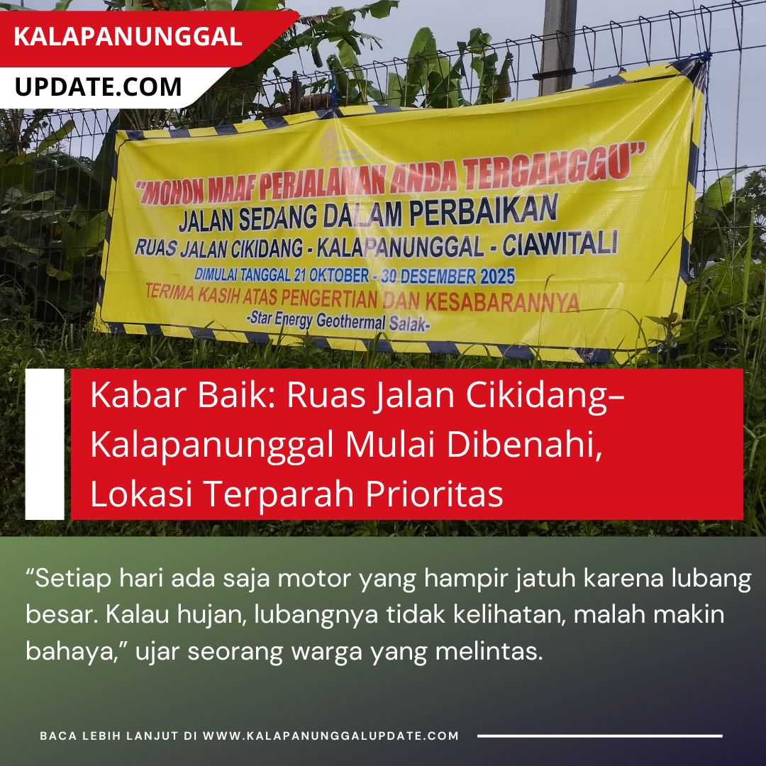 Kalapanunggalupdate.com, Kecamatan Kalapanunggal, — ( 29/11/2025 ). Setelah sekian lama dikeluhkan warga dan pengendara, ruas Jalan Cikidang–Kalapanunggal–Ciawitali akhirnya mulai diperbaiki. Pemberitahuan resmi melalui spanduk kuning yang terpasang di sejumlah titik menyebutkan bahwa proses perbaikan dimulai pada 21 Oktober hingga 30 Desember 2025.