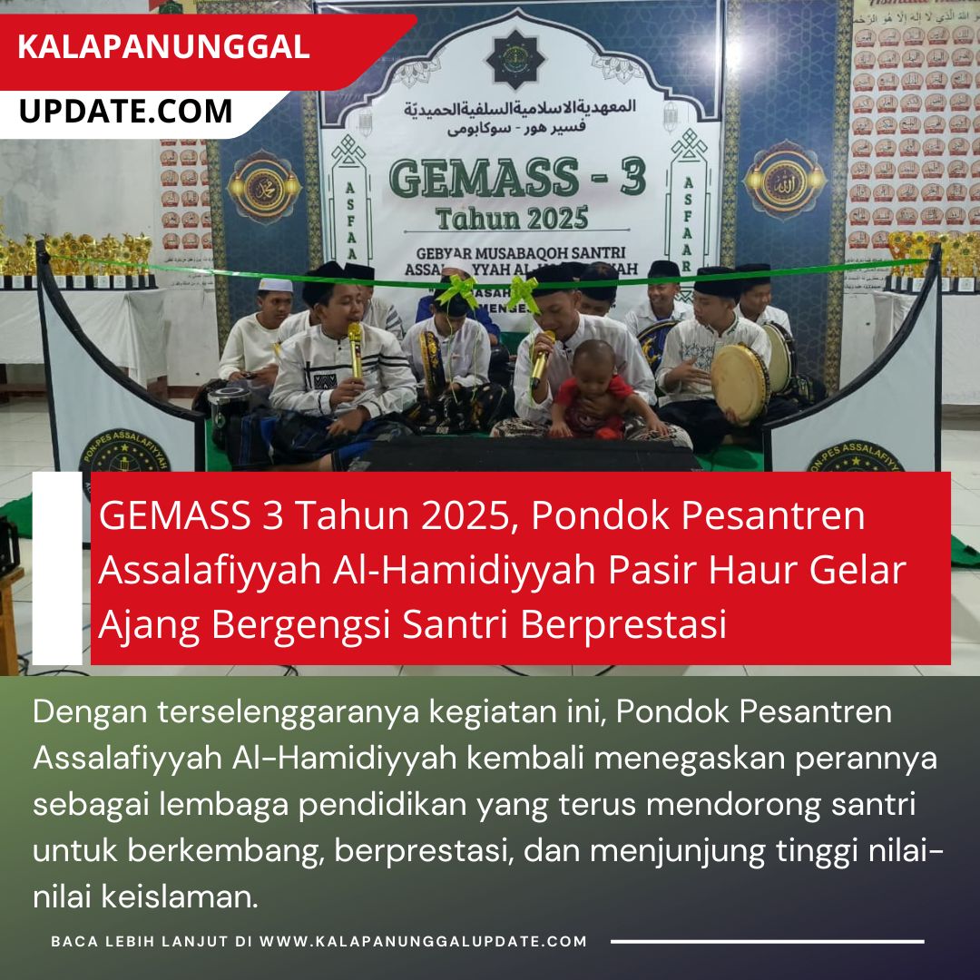 Kalapanunggalupdate.com, Desa Pasir Haur, Kecamatan Bojong Genteng, – ( 29/11/2025 ). Suasana penuh semangat dan kegembiraan tampak memenuhi Aula Pondok Pesantren Assalafiyyah Al-Hamidiyyah Pasir Haur Desa Bojong Galing Kecamatan Bojong Genteng saat GEMASS 3 Tahun 2025 (Gebyar Musabaqoh Santri Assalafiyyah Al-Hamidiyyah) resmi dibuka. Kegiatan akbar tahunan ini diawali dengan penampilan hadroh yang memukau dari para santri, menghadirkan lantunan shalawat yang menggugah hati dan menciptakan suasana religius sejak awal acara.