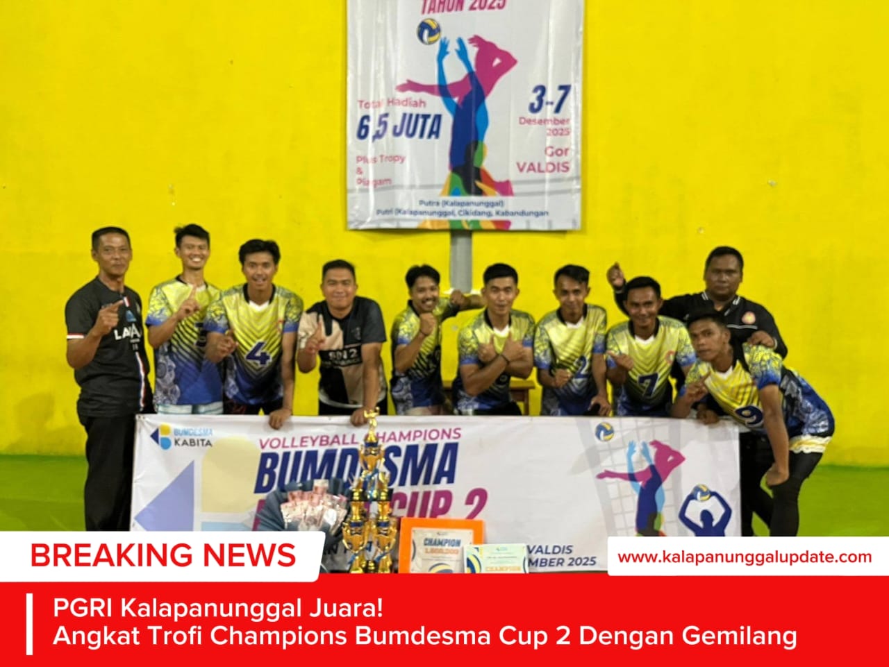 Kalapanunggalupdate.com, PGRI Kalapanunggal, Kabupaten Sukabumi, – ( 8/12/2025 ). Gelaran Volleyball Champions Bumdesma Cup 2 yang berlangsung di GOR Valdis pada 3–7 Desember 2025 resmi berakhir dengan penuh kemeriahan. Turnamen yang menghadirkan tim terbaik dari berbagai wilayah ini berhasil menyajikan persaingan sengit dalam memperebutkan gelar juara.
