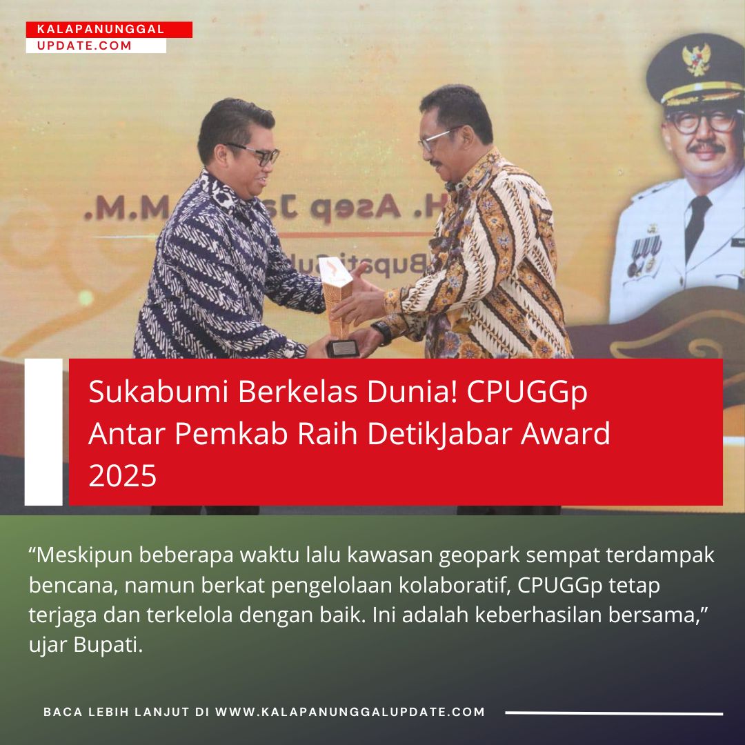 Kalapanunggalupdate.com, Kabupaten Sukabumi, – ( 11/12/2025 ). Pemerintah Kabupaten Sukabumi kembali menorehkan prestasi membanggakan di tingkat Jawa Barat. Pada malam puncak DetikJabar Awards 2025, Rabu (10/12/2025), Kabupaten Sukabumi berhasil meraih penghargaan kategori Pemerintah Daerah Penggerak Wisata Geopark Kelas Dunia.
