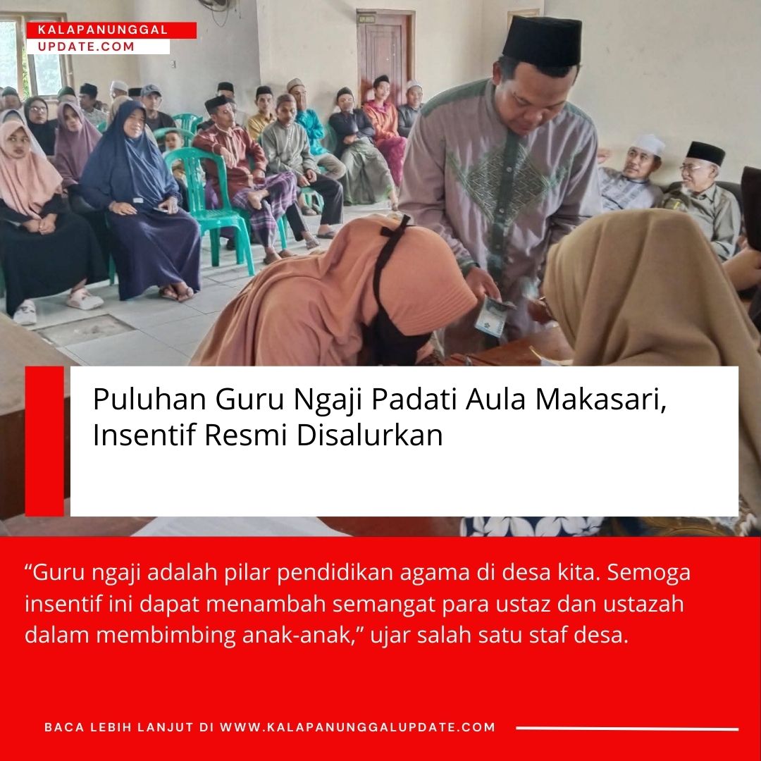 Kalapanunggalupdate.com, Desa Makasari, Kalapanunggal, – ( 11/12/2025 ). Suasana hangat dan penuh kekeluargaan terlihat di Aula Desa Makasari saat kegiatan pembagian insentif bagi para guru ngaji berlangsung pada hari ini. Puluhan guru ngaji dari berbagai wilayah desa hadir memenuhi ruangan sejak pagi, menunggu giliran untuk menerima apresiasi atas dedikasi mereka dalam membina pendidikan agama di tengah masyarakat.