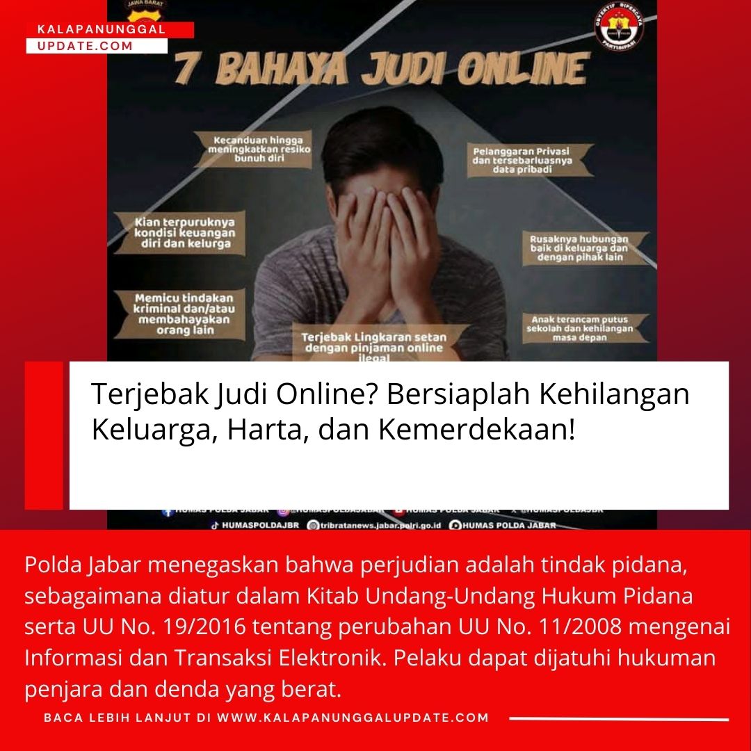 Kalapanunggalupdate.com, HUMAS POLDA JAWA BARAT, – ( 11/12/2025 ). Kepolisian Daerah Jawa Barat kembali mengingatkan masyarakat mengenai maraknya kasus judi online yang kini semakin memprihatinkan. Melalui sebuah pamflet resmi, Polda Jabar menyoroti tujuh bahaya besar judi online yang tidak hanya merusak diri sendiri, tetapi juga keluarga dan lingkungan sosial.