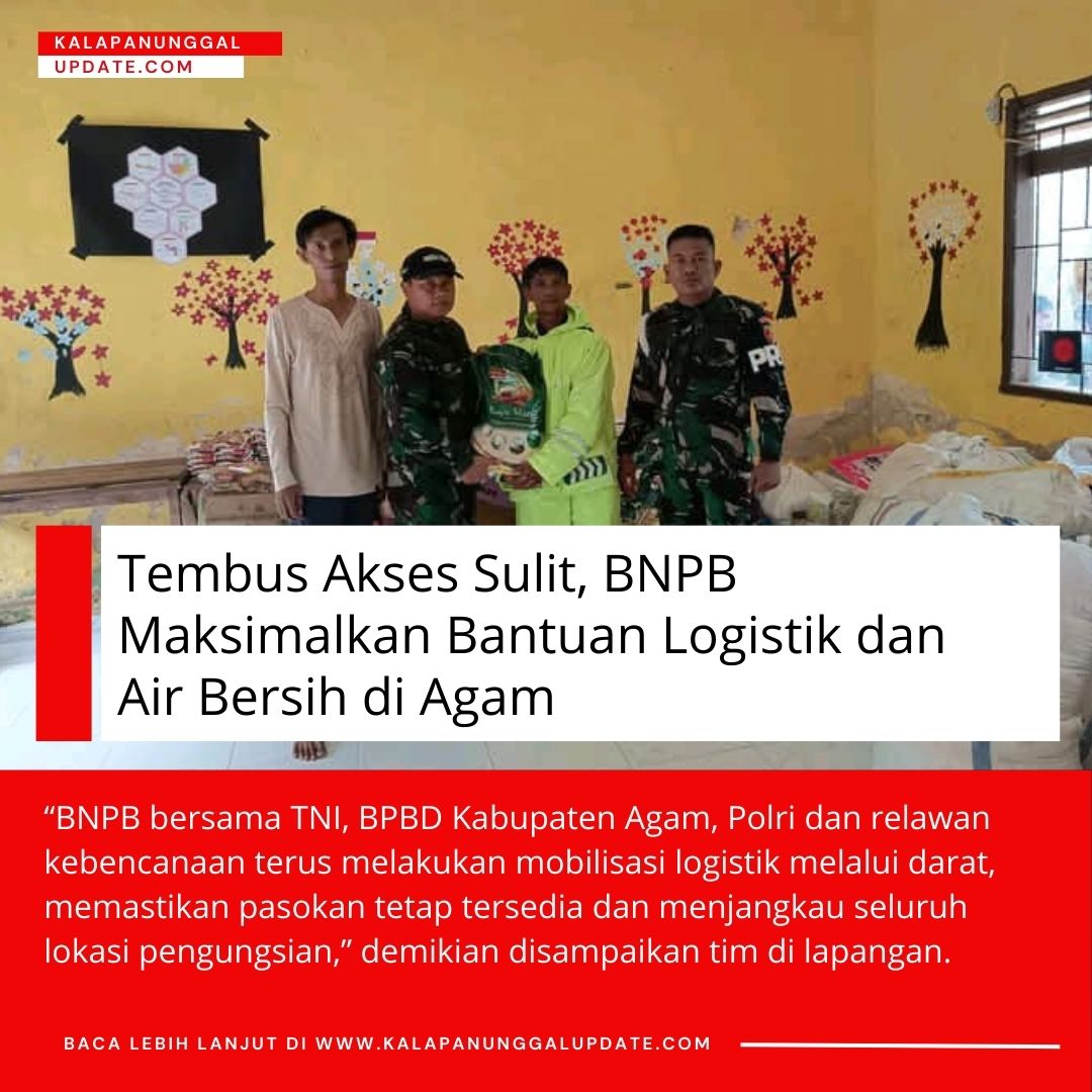“BNPB bersama TNI, BPBD Kabupaten Agam, Polri dan relawan kebencanaan terus melakukan mobilisasi logistik melalui darat, memastikan pasokan tetap tersedia dan menjangkau seluruh lokasi pengungsian,” demikian disampaikan tim di lapangan.