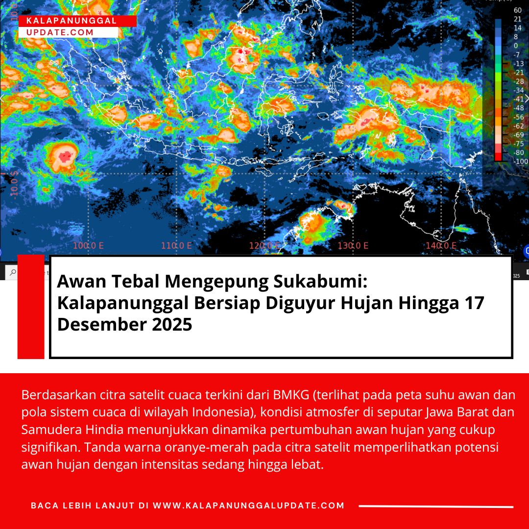 Kalapanunggalupdate.com, BMKG, Kalapanunggal. – ( 12/12/2025 ). Berdasarkan citra satelit cuaca terkini dari BMKG (terlihat pada peta suhu awan dan pola sistem cuaca di wilayah Indonesia), kondisi atmosfer di seputar Jawa Barat dan Samudera Hindia menunjukkan dinamika pertumbuhan awan hujan yang cukup signifikan. Tanda warna oranye-merah pada citra satelit memperlihatkan potensi awan hujan dengan intensitas sedang hingga lebat.