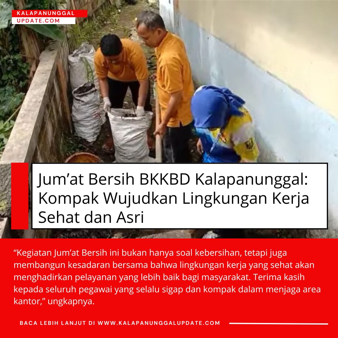 Kalapanunggalupdate.com, BKKBD Kalapanunggal,- ( 12/12/2025 ). Dalam rangka menjaga kebersihan dan meningkatkan kenyamanan lingkungan kerja, jajaran BKKBD Kecamatan Kalapanunggal menggelar kegiatan Jum’at Bersih pada hari ini. Tampak para pegawai dengan kompak saling bahu-membahu membersihkan area halaman dan sudut-sudut lingkungan kantor yang sebelumnya dipenuhi dedaunan serta sampah yang menumpuk akibat hujan beberapa hari terakhir.