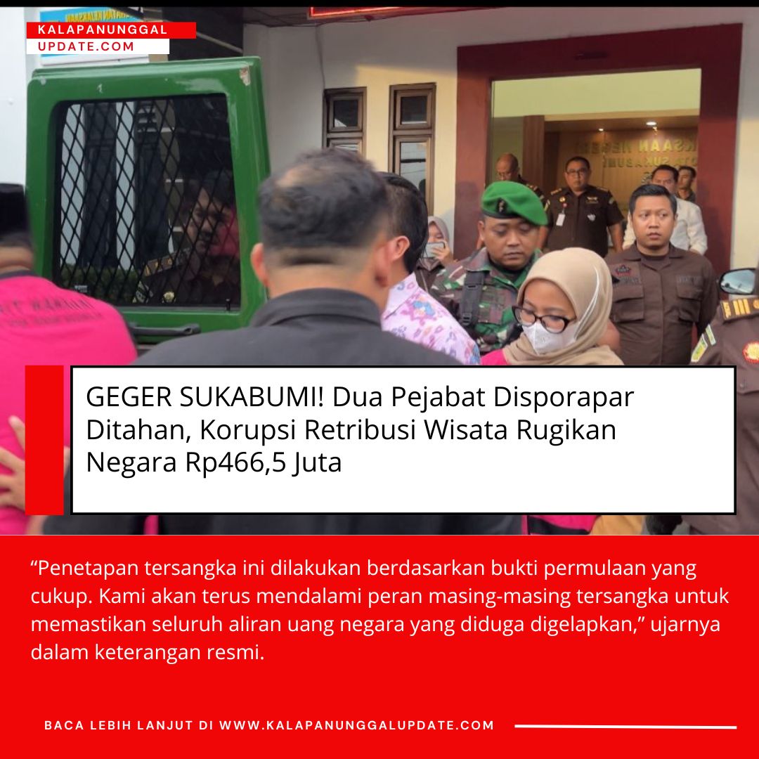 Kalapanunggalupdate.com, Kota Sukabumi,– ( 12/12/2025 ). Kejaksaan Negeri (Kejari) Kota Sukabumi resmi menetapkan dua pejabat Dinas Kepemudaan, Olahraga, dan Pariwisata (Disporapar) sebagai tersangka dalam kasus dugaan korupsi retribusi di dua objek wisata milik Pemerintah Kota Sukabumi, yaitu Pemandian Air Panas Cikundul dan Kolam Renang Rengganis. Keduanya langsung digiring ke mobil tahanan usai menjalani pemeriksaan intensif di kantor Kejari.