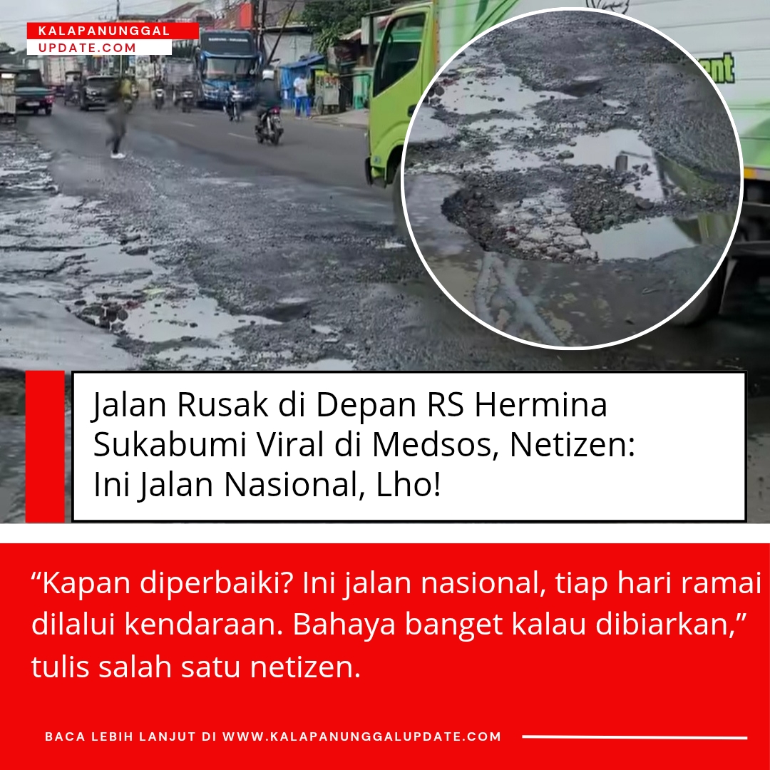 Kalapanunggalupdate.com, SUKABUMI, – ( 13/12/2025 ) Kondisi Jalan Nasional di depan RS Hermina Kota Sukabumi kembali menjadi sorotan publik. Sebuah unggahan di media sosial Facebook memperlihatkan kerusakan jalan yang cukup parah, dipenuhi lubang besar serta genangan air yang membahayakan pengendara. Foto tersebut dengan cepat menarik perhatian dan memicu berbagai komentar dari netizen.