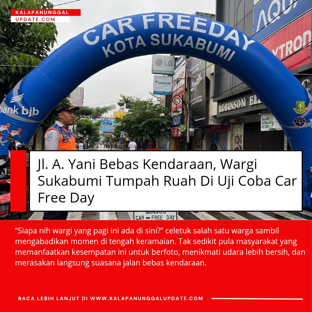 Kalapanunggalupdate.com, KOTA SUKABUMI. – ( 14/12/2025 ). Suasana berbeda tampak di Jl. A. Yani, Kota Sukabumi, Minggu pagi. Ruas jalan utama yang biasanya dipadati kendaraan bermotor, hari ini berubah menjadi ruang publik terbuka dalam rangka uji coba pelaksanaan Car Free Day.