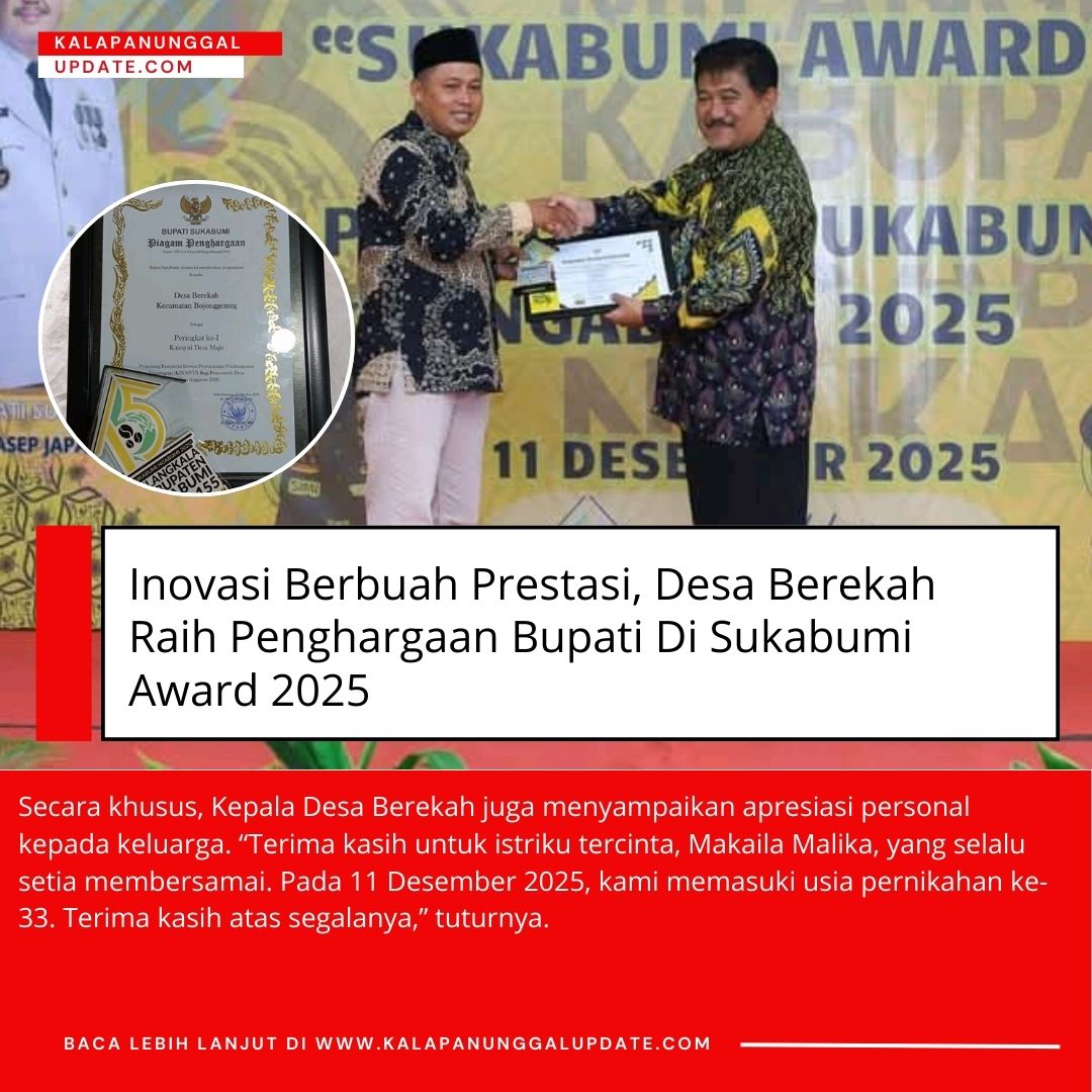 Kalapanunggalupdate.com, Desa Berkah, Bojonggenteng, Jumat (12/12/2025). — Prestasi membanggakan kembali ditorehkan Pemerintah Desa (Pemdes) Berekah. Pada ajang Sukabumi Award 2025, Desa Berekah berhasil meraih Juara I Lomba Kompetisi Inovasi Perencanaan Pembangunan Terintegrasi (KINANTI) 2025 untuk Kategori Desa Maju. Penghargaan tersebut diserahkan langsung oleh Bupati Sukabumi sebagai bentuk apresiasi atas inovasi, kolaborasi, dan keberhasilan pembangunan desa yang berkelanjutan.