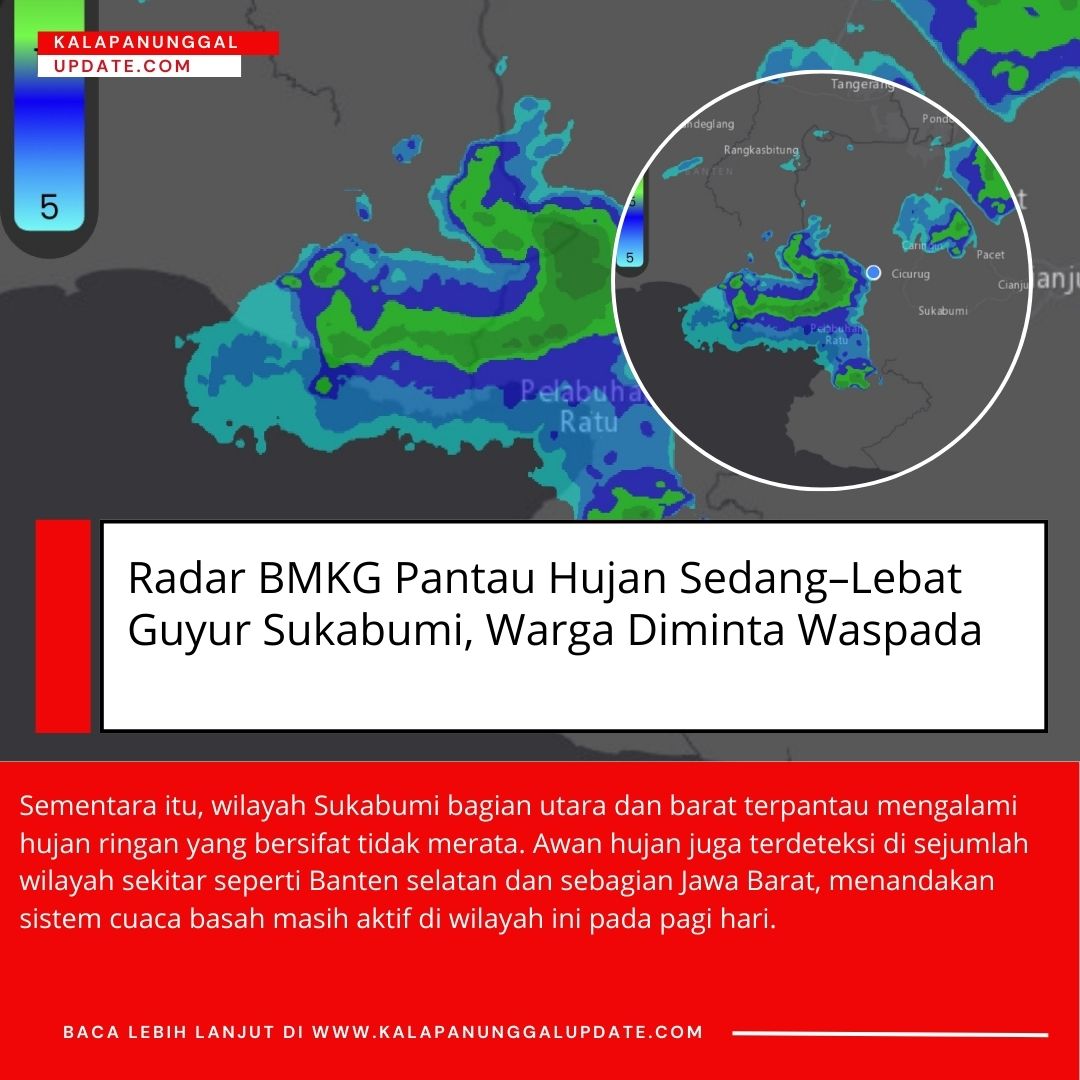 Sementara itu, wilayah Sukabumi bagian utara dan barat terpantau mengalami hujan ringan yang bersifat tidak merata. Awan hujan juga terdeteksi di sejumlah wilayah sekitar seperti Banten selatan dan sebagian Jawa Barat, menandakan sistem cuaca basah masih aktif di wilayah ini pada pagi hari.