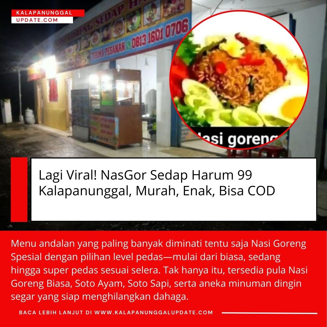 Kalapanunggalupdate.com, Walangsari, Kalapanunggal, – (15/12/2025). Bagi pecinta kuliner malam yang menggugah selera, Warung NasGor Sedap Harum 99 hadir sebagai pilihan tepat. Warung yang berlokasi di Kp. CiBogo Talang RT 01/01, Desa Walangsari, Kalapanunggal, tepat di sebelah Katineng Mang Ujang ini, setiap hari selalu ramai diburu pelanggan berkat cita rasa yang khas, menu lengkap, dan harga yang ramah di kantong.