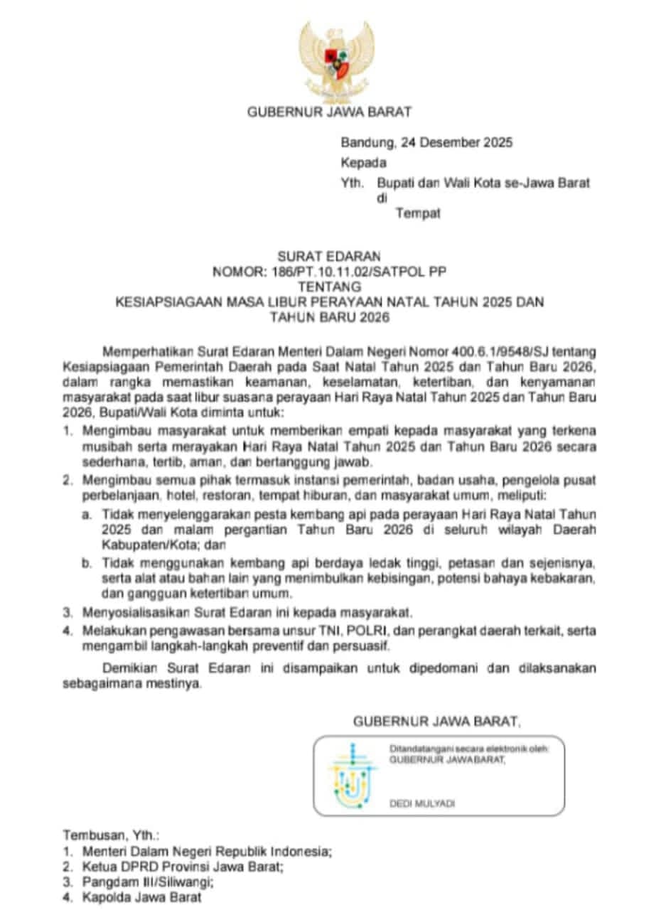 KALAPANUNGGALUPDATE.COM, Bandung. – ( 26/12/2025 ). Pemerintah Provinsi Jawa Barat resmi menerbitkan Surat Edaran Gubernur Jawa Barat Nomor: 186/PT.10.11.02/SATPOL PP tentang Kesiapsiagaan Masa Libur Perayaan Natal 2025 dan Tahun Baru 2026. Surat edaran yang ditandatangani pada 24 Desember 2025 ini ditujukan kepada seluruh Bupati dan Wali Kota se-Jawa Barat sebagai pedoman pengamanan dan pengendalian aktivitas masyarakat selama libur panjang Nataru.