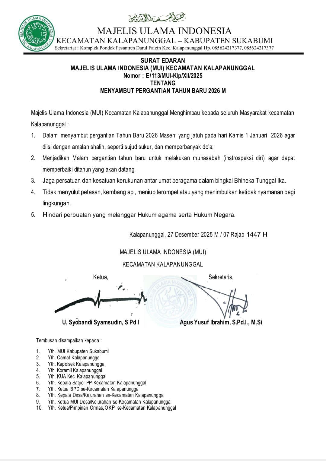 KALAPANUNGGALUPDATE.COM, MUI Kecamatan Kalapanunggal. – ( 28/12/2025 ) . Menyambut pergantian Tahun Baru 2026 Masehi, Majelis Ulama Indonesia (MUI) Kecamatan Kalapanunggal, Kabupaten Sukabumi, resmi menerbitkan Surat Edaran Nomor: E/113/MUI-Klp/XII/2025. Surat edaran tersebut ditetapkan pada Sabtu, 27 Desember 2025 M, bertepatan dengan 07 Rajab 1447 H, dan ditujukan kepada seluruh masyarakat di wilayah Kecamatan Kalapanunggal.