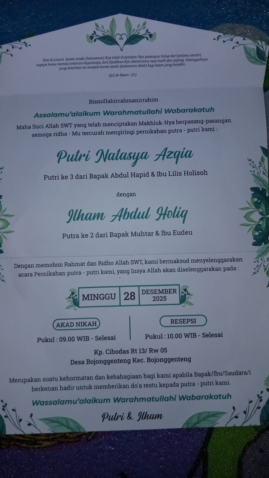 Acara resepsi berlangsung penuh kehangatan, diiringi doa dan harapan agar Putri Natasya Azqya dan pasangan dapat membangun rumah tangga yang sakinah, mawaddah, dan warahmah, serta menjadi keluarga yang harmonis dan penuh berkah.