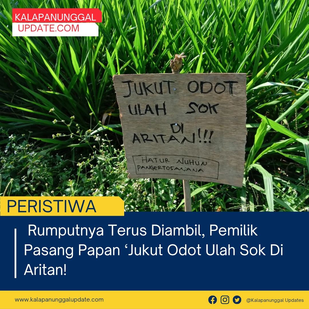 KALAPANUNGGALUPDATE.COM, KALAPANUNGGAL, – ( 2/1/2026 ). Sebuah papan peringatan sederhana namun sarat makna kini berdiri di tengah hamparan hijau lahan pertanian. Terbuat dari papan kayu dengan tulisan tangan, peringatan tersebut berbunyi tegas: “Jukut Odot Ulah Sok Di Aritan!!!” yang berarti Rumput Odot jangan sembarangan disabit. Di bagian bawahnya, tertulis kalimat penutup bernada santun, “Hatur Nuhun Pangeretosanna” atau Terima kasih atas pengertiannya.